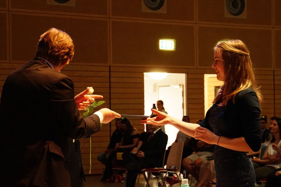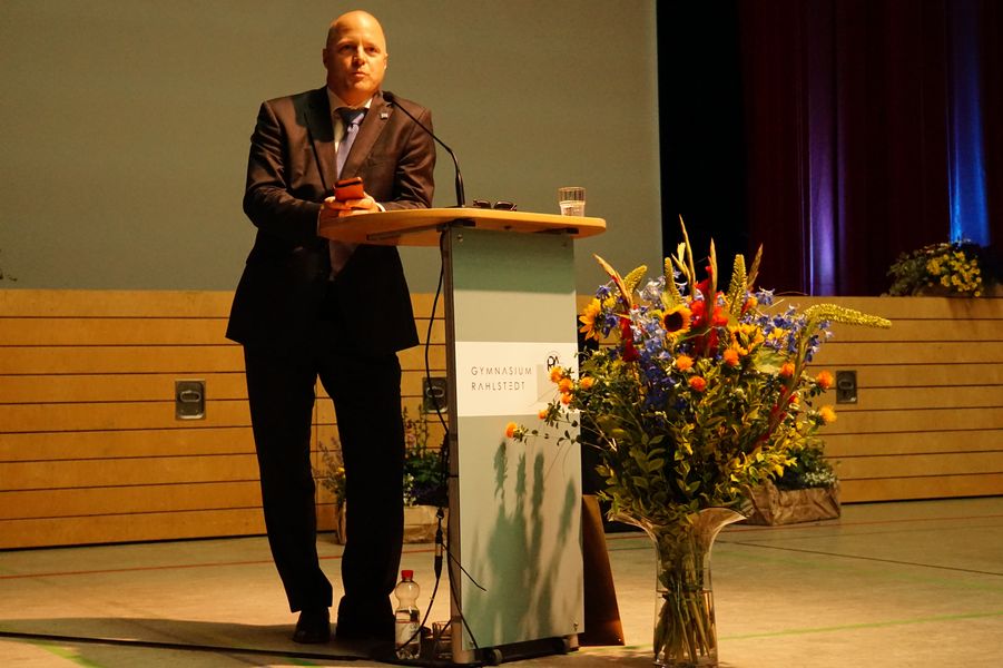 Eröffnet wurde die Veranstaltung durch unseren Oberstufenkoordinator Gerd Püttjer, der dieses Jahr in seinen verdienten Ruhestand wechselt und seinen letzten Abiturjahrgang verabschiedete. Er verwies auf die guten Leistungen der Schüler*innen und gratulierte allen Beteiligten herzlich zum bestandenen Abitur. Unser Schulleiter Florian Frankenfeld nahm in seiner Rede Bezug zu einer Tierfabel des altgriechischen Fabeldichters Äsop und zeigte den Schüler*innen Perspektiven für ihren zukünftigen Lebensweg auf.