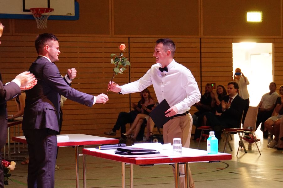 Beeindruckend, wie diese im Anschluss bei der Verleihung der Zeugnisse ihren Dank an die Schule zum Ausdruck brachten. Auch in dieser Hinsicht hat der Jahrgang überzeugt und sich warmherzig für die Unterstützung und Hilfe in den letzten Monaten bedankt. Die Tutor*innen Frau Fründt, Herr Wilson, Herr Köhler, Herr Kubisch und Herr Wagner gaben in warmen Worten diesen Dank zurück und teilten in einer gelungenen Zeremonie die Zeugnisse an die sichtlich gerührten Schüler*innen aus.