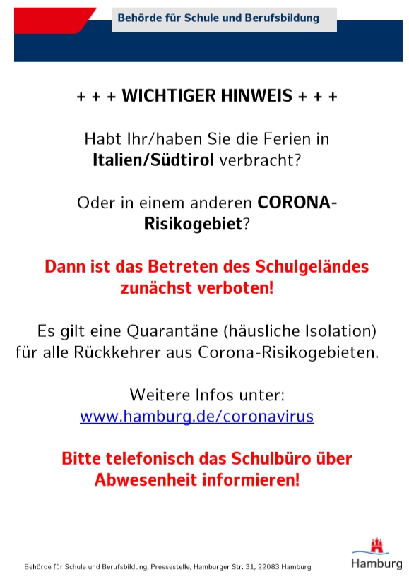 Beachten Sie bitte unbedingt, dass Rückkehrern aus Risikogebieten 14 Tage lang der Zutritt zu Schulen verboten ist. Zu den Risikogebieten nach Definition des Robert-Koch-Instituts zählen mit Stand 15.03.2020 ganz Italien, Iran, China :Provinz Hubei inkl. Stadt Wuhan, Südkorea: Provinz Gyeongsangbuk-do, Frankreich: Region Grand Est (diese Region enthält Elsass, Lothringen und Champagne-Ardenne), Österreich: Bundesland Tirol,