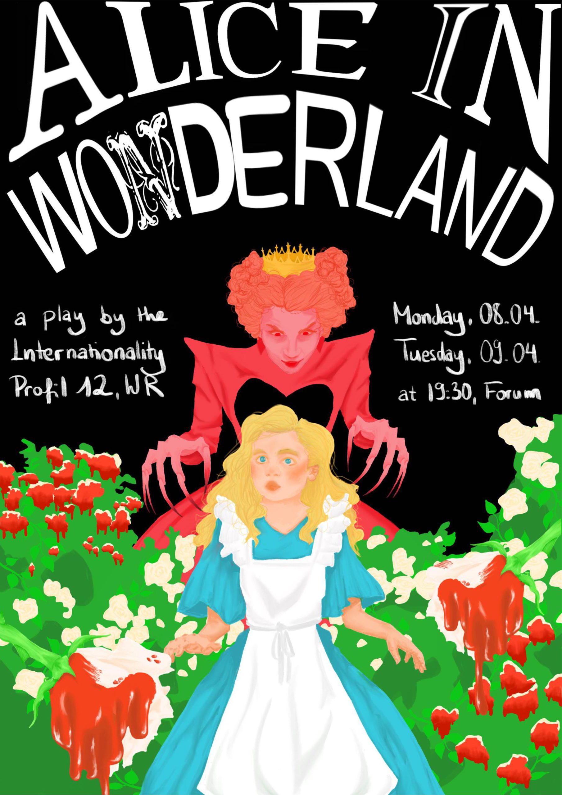 Die absurde Erzählung Lewis Carrolls ist vielfältig bekannt: Als Kinderbuch, als Disney-Film oder in der filmischen Neubearbeitung von Tim Burton. Nun wagt sich das Internationality Profile an die englische Fassung und präsentiert sie, auf dem Original basierend und inspiriert durch die Filmfassungen, in einer phantasievollen eigenen Bearbeitung, die heute, Montag, den 8.4., um 19:30 Uhr im Forum erstmals zu sehen ist (zweite Aufführung Dienstag, 9.4., ebenfalls 19:30 Uhr Forum).