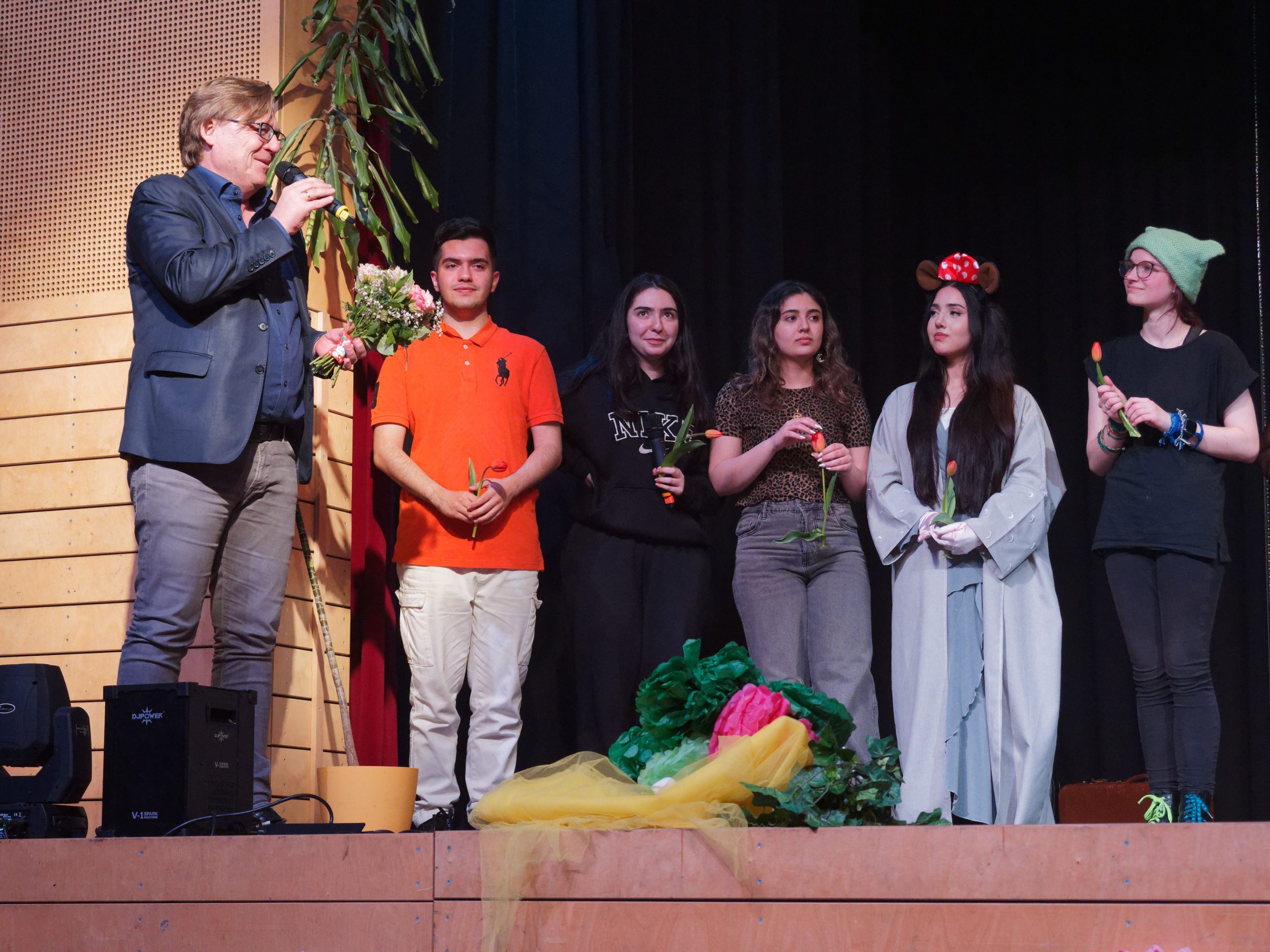 Eine Theateraufführung auf einer Bühne. Eine Gruppe von Darstellern in bunten Kostümen interagiert, während ein männlicher Darsteller in der Mitte singt oder spricht. Im Hintergrund sind Dekorationen mit Herzen und ein Publikum sichtbar. Die Darsteller zeigen verschiedene Emotionen und Bewegungen, die zur Handlung der Aufführung beitragen.Eine Frau in einem roten, traditionellen Kleid steht auf einer Bühne und hält mehrere rote Luftballons. Neben ihr steht eine weitere Frau, die ein großes Plakat mit der Zahl Ein junger Mann in einem schwarzen Gewand mit goldenen Verzierungen steht auf einer Bühne. Er hält ein blaues Mikrofon in der Hand und singt oder spricht. Im Hintergrund sind einige weiße und schwarze Stoffe sichtbar, die eine Bühnenkulisse bilden.Drei Schauspieler auf einer Bühne. Zwei Männer im Vordergrund sitzen an einem Tisch, auf dem ein buntes Tuch liegt, und tragen Hüte. Ein dritter Mann steht im Hintergrund, trägt einen langen Umhang und hält einen Stock in der Hand. Der Hintergrund ist mit grünen Pflanzen und bunten Ballons dekoriert.Eine Bühnenaufführung mit vier Schauspielerinnen. Drei sitzen an einem Tisch, während eine viert Schauspielerin mit einem Hasenohrenkostüm auf der Bühne steht. Der Tisch ist mit einem bunten Tuch bedeckt, und im Hintergrund sind grüne Pflanzen und digitale Bildschirme mit Naturmotiven zu sehen.Zwei Schauspielerinnen auf einer Bühne in einem Theaterstück. Eine Frau trägt eine bunte Kostümiert mit einem großen gelben Hut und steht neben einem Tisch, der mit einem grünen Tuch bedeckt ist. Die andere Frau in einem blauen Kleid schaut neugierig auf die erste. Im Hintergrund sind farbenfrohe digitale Landschaften zu sehen.Drei Schauspieler auf einer Bühne: Ein junger Mann in gestreiftem Hemd und einer bunten Mütze steht links, ein weiterer Mann in buntem Outfit mit Hosenträgern steht in der Mitte und gestikuliert, während eine junge Frau in einem blauen Kleid rechts steht. Der Hintergrund ist rot.Zwei Schauspielerinnen auf einer Bühne. Die linke Person trägt eine blaue Jacke, orangefarbene Hosen und einen auffälligen Hut. Sie hält eine Flasche in der Hand. Die rechte Person trägt ein graues Kleid und hält einen großen Koffer sowie ein Stofftier. Im Hintergrund ist ein Schild mit der Aufschrift Eine Gruppe von fünf Personen steht auf einer Bühne. Eine Person spricht mit einem Mikrofon und hält einen Strauß Blumen in der Hand. Die anderen vier Personen stehen neben ihm, einige tragen interessante Kostüme und halten ebenfalls Blumen. Im Hintergrund sind dekorative Elemente und eine dunkle Bühnenkulisse zu sehen.