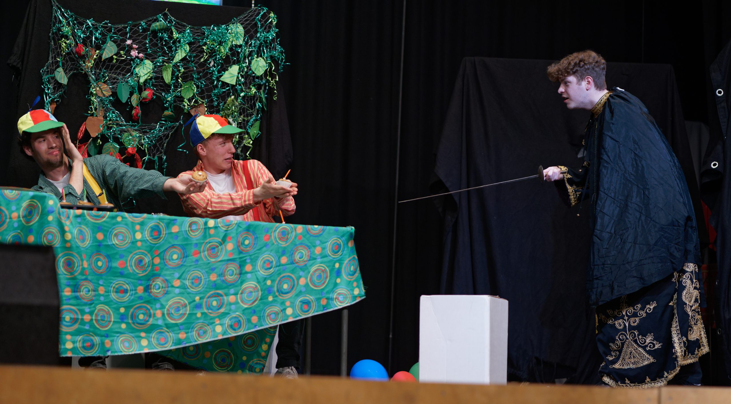 Eine Theateraufführung auf einer Bühne. Eine Gruppe von Darstellern in bunten Kostümen interagiert, während ein männlicher Darsteller in der Mitte singt oder spricht. Im Hintergrund sind Dekorationen mit Herzen und ein Publikum sichtbar. Die Darsteller zeigen verschiedene Emotionen und Bewegungen, die zur Handlung der Aufführung beitragen.Eine Frau in einem roten, traditionellen Kleid steht auf einer Bühne und hält mehrere rote Luftballons. Neben ihr steht eine weitere Frau, die ein großes Plakat mit der Zahl Ein junger Mann in einem schwarzen Gewand mit goldenen Verzierungen steht auf einer Bühne. Er hält ein blaues Mikrofon in der Hand und singt oder spricht. Im Hintergrund sind einige weiße und schwarze Stoffe sichtbar, die eine Bühnenkulisse bilden.Drei Schauspieler auf einer Bühne. Zwei Männer im Vordergrund sitzen an einem Tisch, auf dem ein buntes Tuch liegt, und tragen Hüte. Ein dritter Mann steht im Hintergrund, trägt einen langen Umhang und hält einen Stock in der Hand. Der Hintergrund ist mit grünen Pflanzen und bunten Ballons dekoriert.Eine Bühnenaufführung mit vier Schauspielerinnen. Drei sitzen an einem Tisch, während eine viert Schauspielerin mit einem Hasenohrenkostüm auf der Bühne steht. Der Tisch ist mit einem bunten Tuch bedeckt, und im Hintergrund sind grüne Pflanzen und digitale Bildschirme mit Naturmotiven zu sehen.Zwei Schauspielerinnen auf einer Bühne in einem Theaterstück. Eine Frau trägt eine bunte Kostümiert mit einem großen gelben Hut und steht neben einem Tisch, der mit einem grünen Tuch bedeckt ist. Die andere Frau in einem blauen Kleid schaut neugierig auf die erste. Im Hintergrund sind farbenfrohe digitale Landschaften zu sehen.Drei Schauspieler auf einer Bühne: Ein junger Mann in gestreiftem Hemd und einer bunten Mütze steht links, ein weiterer Mann in buntem Outfit mit Hosenträgern steht in der Mitte und gestikuliert, während eine junge Frau in einem blauen Kleid rechts steht. Der Hintergrund ist rot.Zwei Schauspielerinnen auf einer Bühne. Die linke Person trägt eine blaue Jacke, orangefarbene Hosen und einen auffälligen Hut. Sie hält eine Flasche in der Hand. Die rechte Person trägt ein graues Kleid und hält einen großen Koffer sowie ein Stofftier. Im Hintergrund ist ein Schild mit der Aufschrift Eine Gruppe von fünf Personen steht auf einer Bühne. Eine Person spricht mit einem Mikrofon und hält einen Strauß Blumen in der Hand. Die anderen vier Personen stehen neben ihm, einige tragen interessante Kostüme und halten ebenfalls Blumen. Im Hintergrund sind dekorative Elemente und eine dunkle Bühnenkulisse zu sehen.