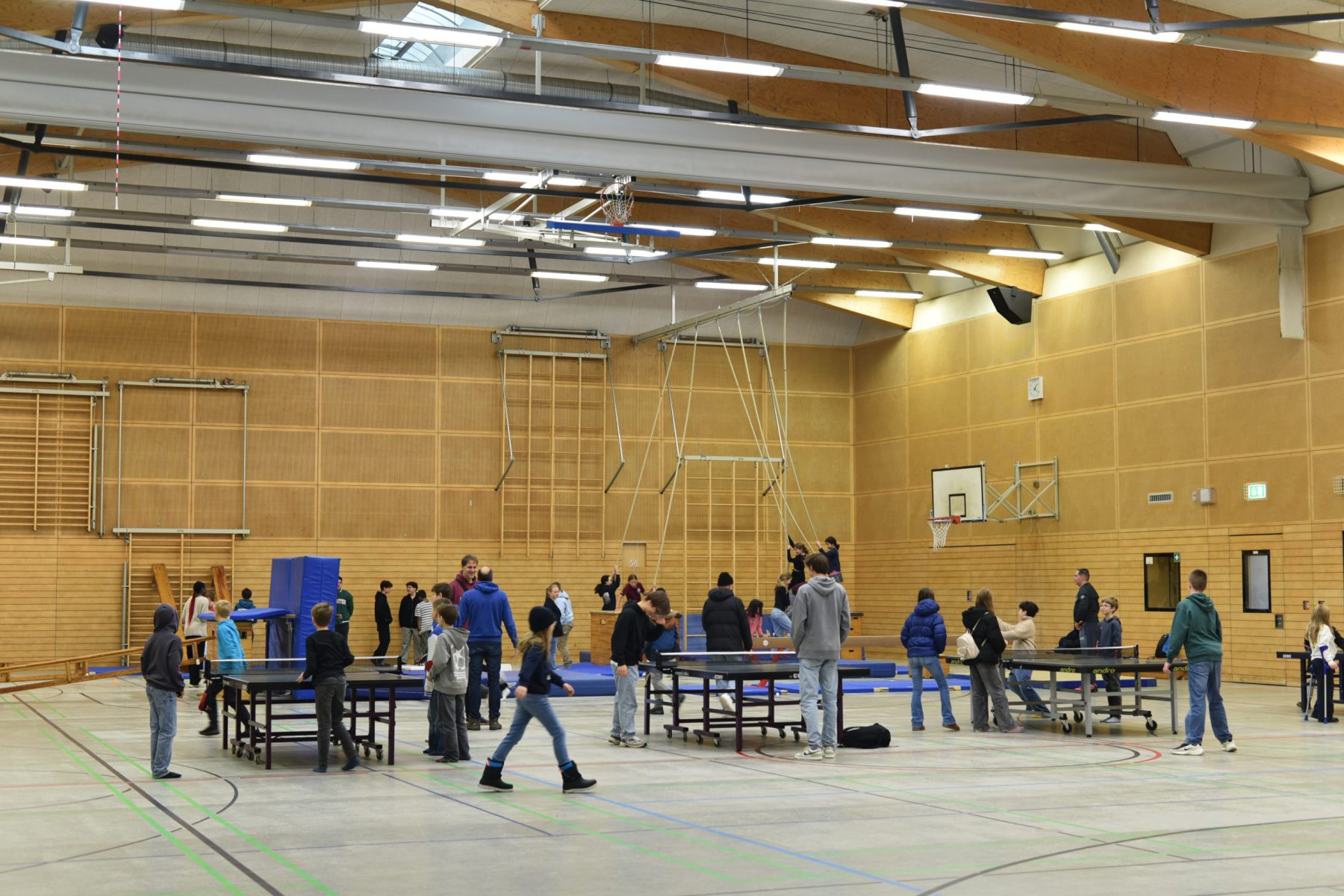 In the gym a vibrant world of movement unfolded: trampoline, climbing, table tennis, DJ music, first aid to try out and the stand of “Healthy and Active School”.