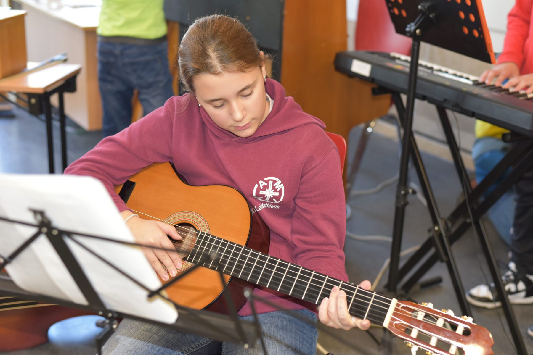 在小型音樂室,孩子們可以嘗試提琴與吉他,家長也能了解學校的音樂實踐課程。大音樂室則由日間樂隊與五年級組成的合奏隊帶來排練工作的洞見。