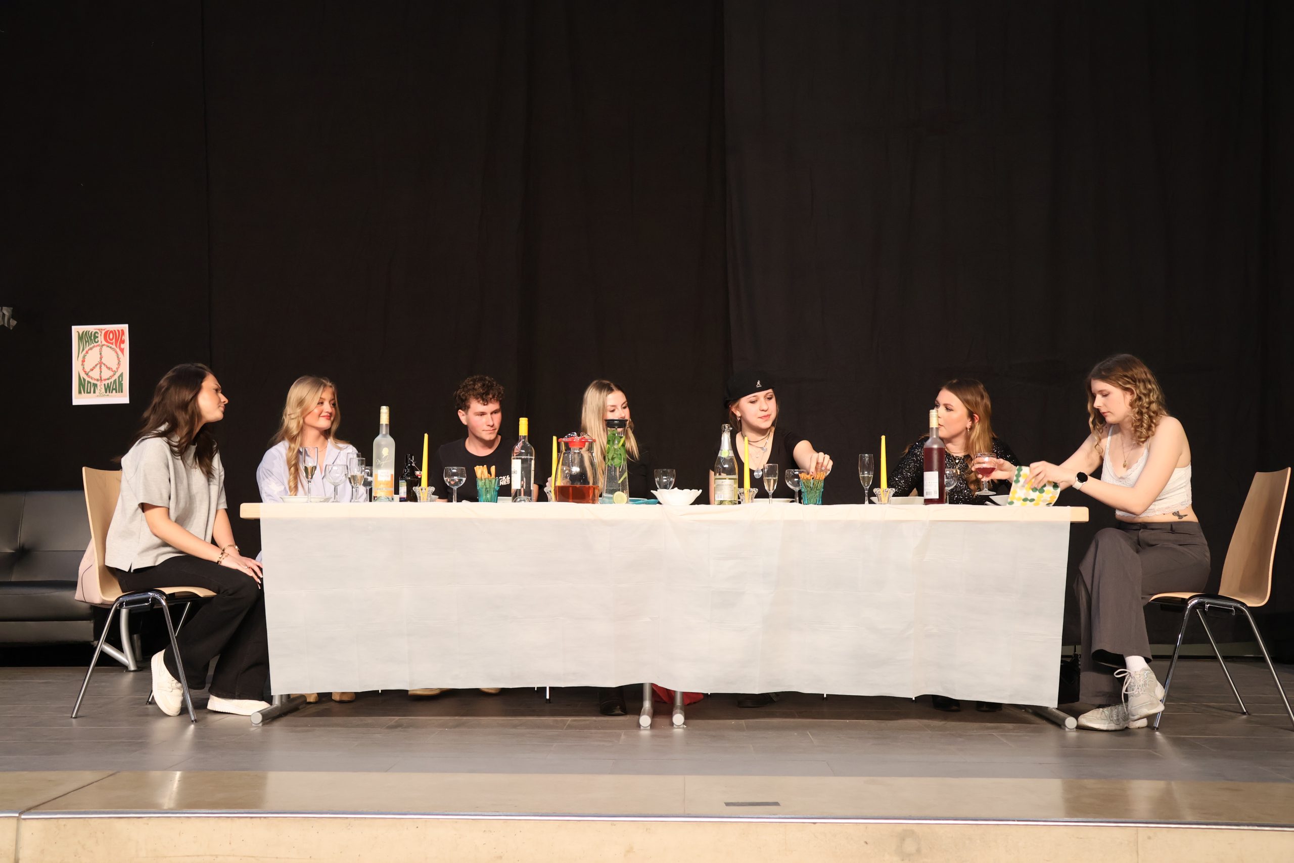 Herrlich entspannt beginnt die Inszenierung „Auf laut gestellt“ der S4 unter der Leitung von Antje Kirchbauer. Ein Pärchen bereitet ein gemeinsames Essen mit Freundinnen und Freunden aus alten Zeiten vor. Die Servietten sind nach Farben geordnet, ehemalige Schulfreunde treffen sich als junge Erwachsene. Der alkoholfreie Sekt knallt furios – die vegetarische Bolognese passt genau ins Bild – Achtsamkeit ist das Motto – Make love not war.