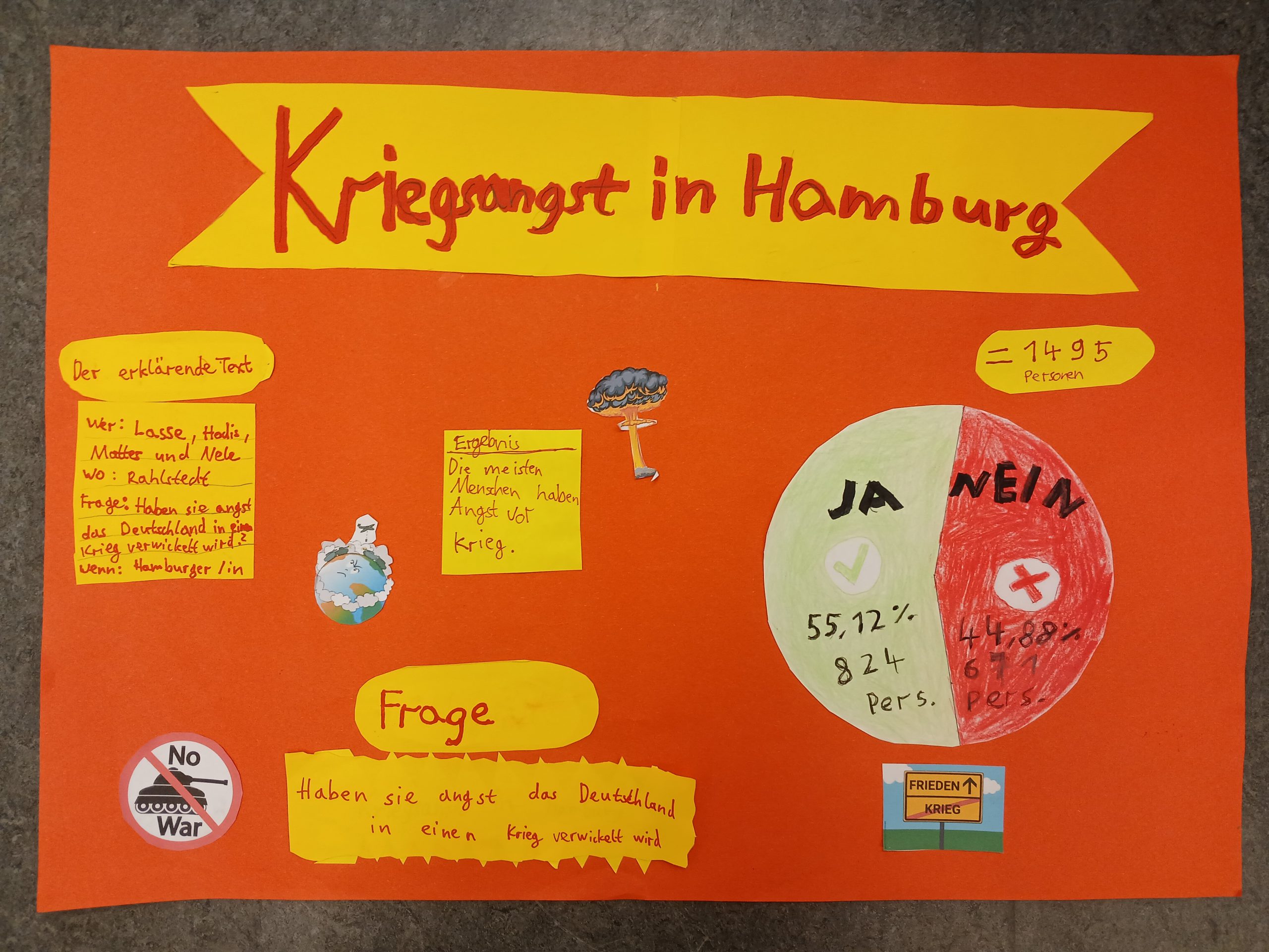 Im Mathematikunterricht bei Herrn Massong haben wir ein Umfrageprojekt durchgeführt. Als Thema haben wir „Krieg“ gewählt, weil er viele Menschen betrifft und wir wissen wollten, ob und wie viele Menschen Angst vor Krieg haben.