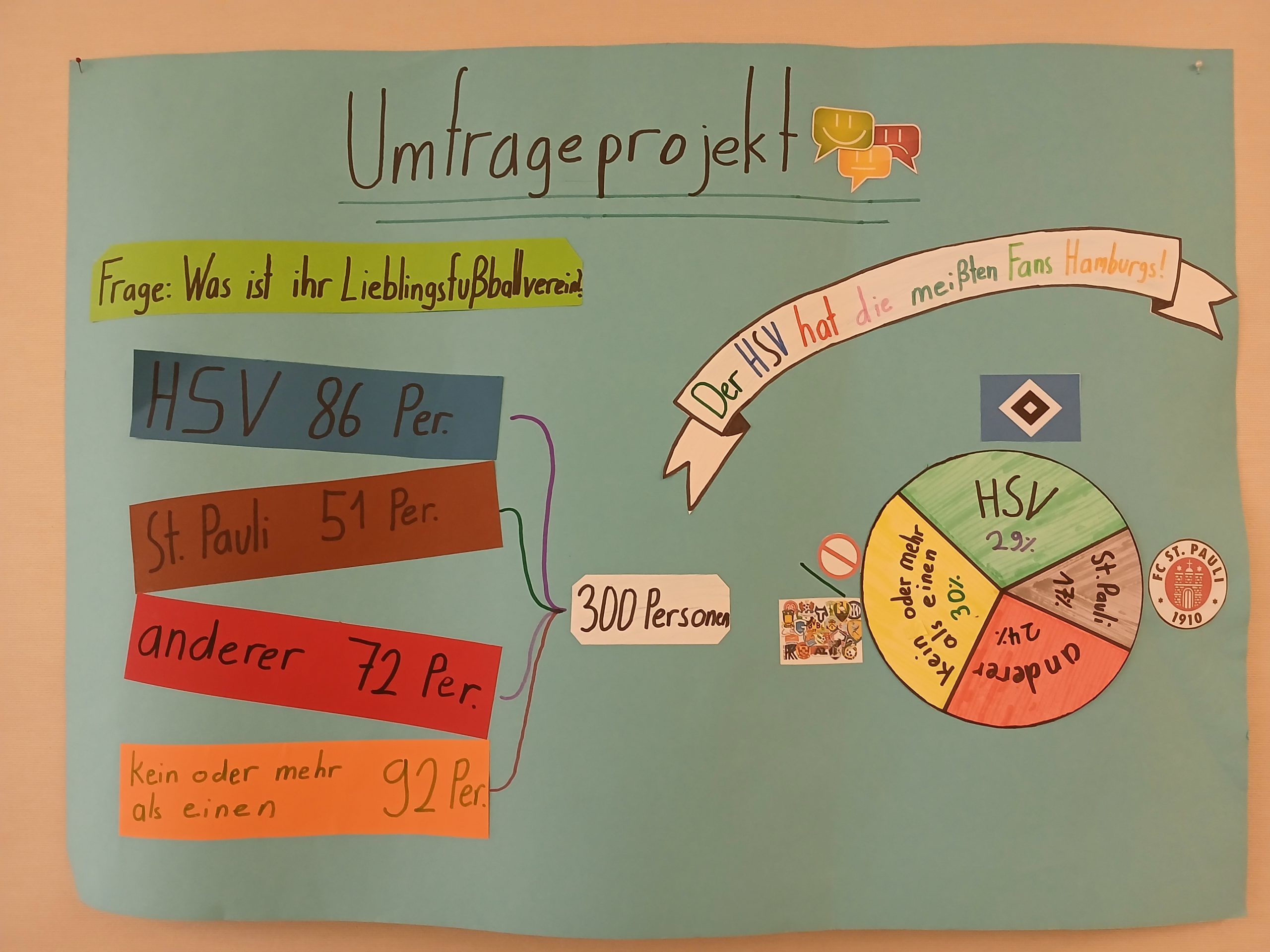 Wir sind Rabija, Lili und Shahzad. Wir kommen aus der Klasse 5b. Von November bis Januar haben wir im Fach Mathe ein Umfrageprojekt gemacht, das von Herrn Massong geleitet wurde. Ende 2025 durften wir unsere Plakate gestalten. Als Frage wählten wir: „Was ist Ihr Lieblingsfußballverein?“ Insgesamt haben wir 300 Leute gefragt. Und das ist das Ergebnis: