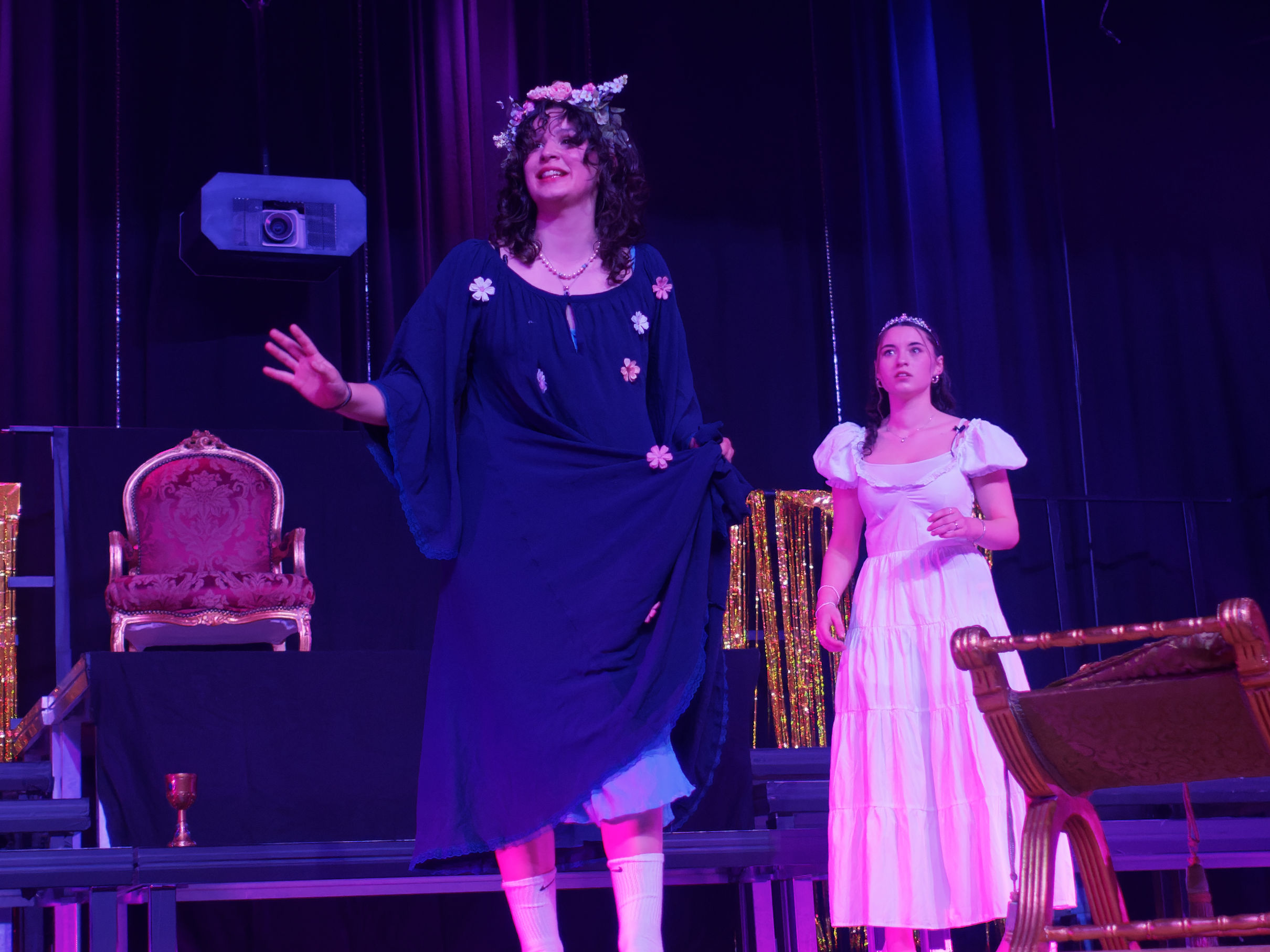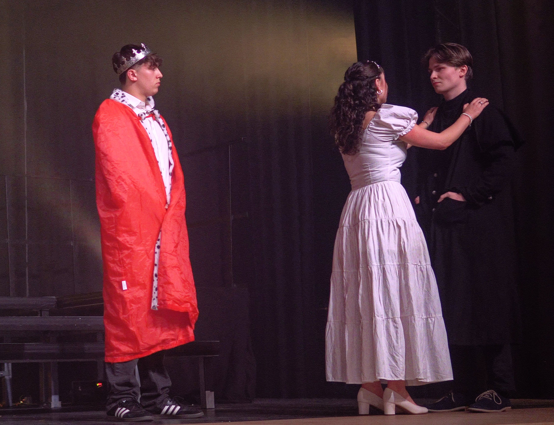 Eine Frau sitzt auf der Bühne in einem warmen, goldenen Scheinwerferlicht. Sie trägt ein schlichtes Kleid und hält ein Buch in den Händen. Neben ihr steht ein leerer Stuhl. Der Hintergrund ist dunkel und unscharf, was die Aufmerksamkeit auf die Frau und das Licht lenkt. Eine Szene aus einem Theaterstück, in der ein männlicher Darsteller in einem weißen Hemd und dunkler Hose auf einen weiblichen Charakter in einem blauen Kleid zeigt, der auf einem Stuhl sitzt. Im Hintergrund sind dekorative Elemente und eine Bühne sichtbar. Drei Schauspieler auf einer Bühne. Einer trägt einen roten Umhang und eine Krone, während er auf zwei andere Figuren schaut. Die zweite Figur ist eine Frau in einem weißen Kleid, die den dritten Schauspieler in schwarzer Kleidung anfasst. Die Szene vermittelt eine dramatische Interaktion. Im Hintergrund sind schwaches Licht und eine dunkle Kulisse zu sehen. Zwei Personen auf einer Bühne in einem dunklen, blauen Licht. Eine Person steht mit verschränkten Armen und einem nachdenklichen Ausdruck, während die andere Person mit einem ausgestreckten Arm in eine Richtung zeigt. Im Hintergrund sind zwei dekorative Stühle und eine goldene Dekoration sichtbar. Drei Personen stehen auf einer Bühne in blauer Beleuchtung. Zwei Personen tragen schwarze Jacken und wirken nachdenklich, während die dritte Person, eine Frau in einem langen schwarzen Mantel, gestikuliert und spricht. Im Hintergrund ist ein Tisch zu sehen, der von einem goldenen Vorhang umgeben ist. Zwei Schauspielerinnen auf einer Bühne während einer Theateraufführung. Die linke Schauspielerin trägt ein langes, blaues Kleid mit Blumenmotiven und eine Blumenkrone. Sie gestikuliert mit der linken Hand. Die rechte Schauspielerin steht in einem weißen Kleid und schaut aufmerksam. Im Hintergrund sind Bühnenrequisiten und eine dunkle Bühnenbeleuchtung zu sehen. Zwei Schauspieler stehen auf einer Theaterbühne. Der erste Schauspieler trägt einen langen, schwarzen Umhang und steht auf der linken Seite, während der zweite Schauspieler, in einer schwarzen Jacke und Jeans, auf der rechten Seite steht. Im Hintergrund sind goldene Dekorationen und mehrere Bänke zu sehen. Die Bühne ist beleuchtet und es herrscht eine dramatische Atmosphäre. Eine Szene auf einer Bühne, in der eine junge Frau in einem weißen Kleid sitzt und eine andere Person, die schwarz gekleidet ist, sich vorbeugt, um etwas aufzuheben. Im Hintergrund sind dunkle Vorhänge und ein goldenes Dekor sichtbar. Zwei Schauspieler auf einer Bühne in einem Theater. Der linke Schauspieler trägt einen langen schwarzen Umhang und steht mit ernstem Gesichtsausdruck. Die rechte Schauspielerin steht in lässiger Kleidung und blickt ebenfalls ernst. Im Hintergrund sind goldene Dekorationen und einige Bankreihen sichtbar. Eine Frau in einem weißen Kleid sitzt auf der Bühne und schaut nachdenklich. Eine andere Person in schwarzer Kleidung beugt sich vor, um einen Stuhl zu bewegen. Der Hintergrund ist dunkel, und es gibt eine goldene Dekoration im Hintergrund. Zwei Tänzerinnen in bunten Kostümen stehen auf einer Bühne, während zwei weitere Personen im Hintergrund agieren. Die Bühne ist mit goldenen Vorhängen dekoriert. Eine der Tänzerinnen trägt ein pinkes Oberteil und hält ein blaues Tuch, während die andere ein schwarzes Outfit trägt. Im Hintergrund sind weitere Darsteller in grünen und schwarzen Kostümen zu sehen. Drei Personen auf einer Bühne in Kostümen während einer Aufführung. Eine Person trägt einen schwarzen Hut und hält ein Blatt Papier, während sie spricht. Eine zweite Person, in einem roten Umhang, schaut verwirrt, und eine dritte Person in einem weißen Kleid hört aufmerksam zu. Im Hintergrund ist ein glitzernder Vorhang zu sehen. Vier Schauspieler auf einer Bühne, die miteinander interagieren. Einer trägt einen glitzernden grünen Blazer, ein anderer einen roten Umhang und eine Mütze. Die dritte Person trägt ein weißes Kleid und eine Krone, während die vierte Person in einem schwarzen Outfit mit goldenen Akzenten gekleidet ist. Alle halten Gläser in der Hand. Im Hintergrund ist ein Tisch mit einem goldenen Tischdecken sichtbar. Eine Person in einem roten Umhang und einer goldenen Krone steht im Vordergrund und hält eine Hand aus, während eine andere Person kniend vor ihr sitzt und sie ansieht. Der Hintergrund ist dunkel, und ein Lichtstrahl beleuchtet die Szene, was eine dramatische Atmosphäre schafft. Eine Person liegt auf der Bühne und hält eine Waffe in die Höhe. Die Umgebung ist schwach beleuchtet, und im Hintergrund sind unscharfe, dunkle Formen zu erkennen. Die Person trägt eine schwarze Kleidung und hat eine entspannte Körperhaltung. Vier Personen auf einer Bühne, die in historischen Kostümen mit Kronen gekleidet sind. Eine Person trägt einen roten Umhang und steht im Vordergrund, während eine andere Person kniet und überrascht wirkt. Die Beleuchtung hebt die Charaktere hervor und sorgt für eine dramatische Atmosphäre.