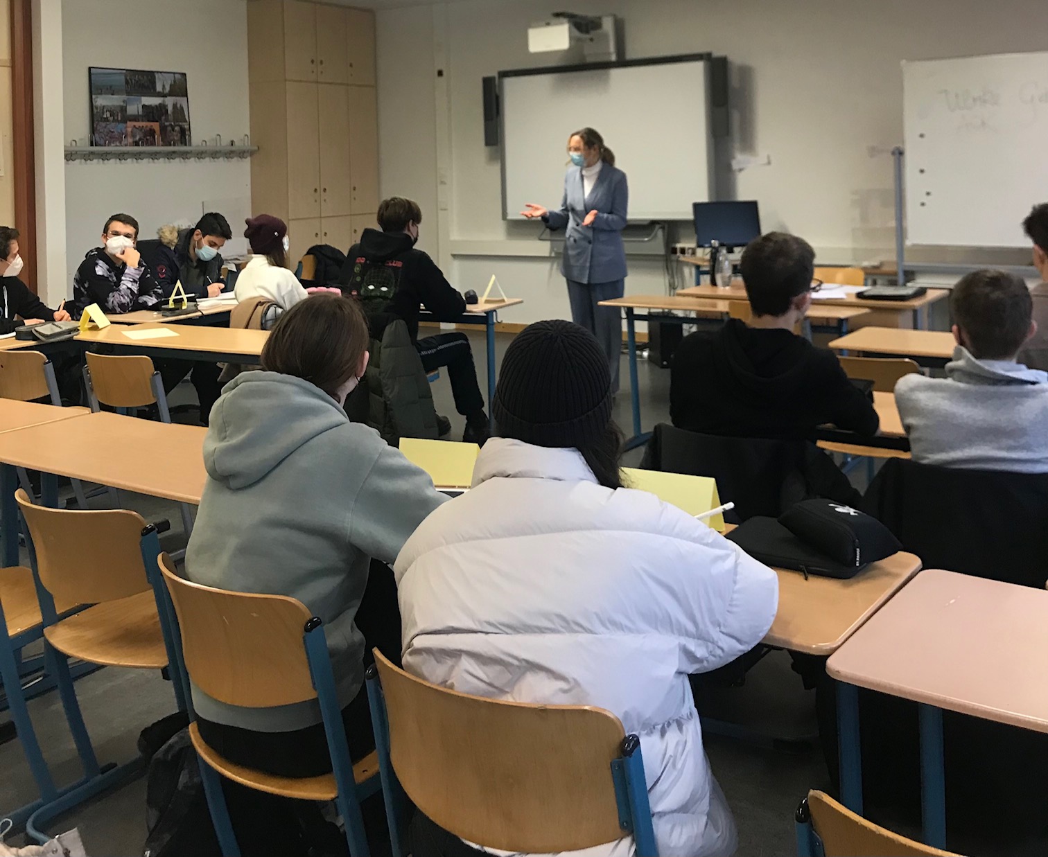 „Bist du aufgeregt? Warum hast du dich hier beworben?“ Auf diese und andere Fragen mussten die Teilnehmenden aus der Oberstufe spontane und dennoch überzeugende Antworten finden. Dabei wurde deutlich, dass es gar nicht so einfach zu durchschauen ist, worauf es dabei ankommt in einer realen Bewerbungssituation. Deshalb wurden die Tipps und Hinweise der Referentin aufmerksam verfolgt und notiert. Wie kann ich mich gut präsentieren? Was macht mich aus? Wie wirke ich authentisch? Wie kann ich mich gut auf ein Gespräch vorbereiten? Mit diesen Fragen im Kopf und mit vielen neuen Ideen und Anregungen für die nächsten Schritte und Bewerbungen gingen die Teilnehmenden nach Hause. Viel Erfolg dabei!