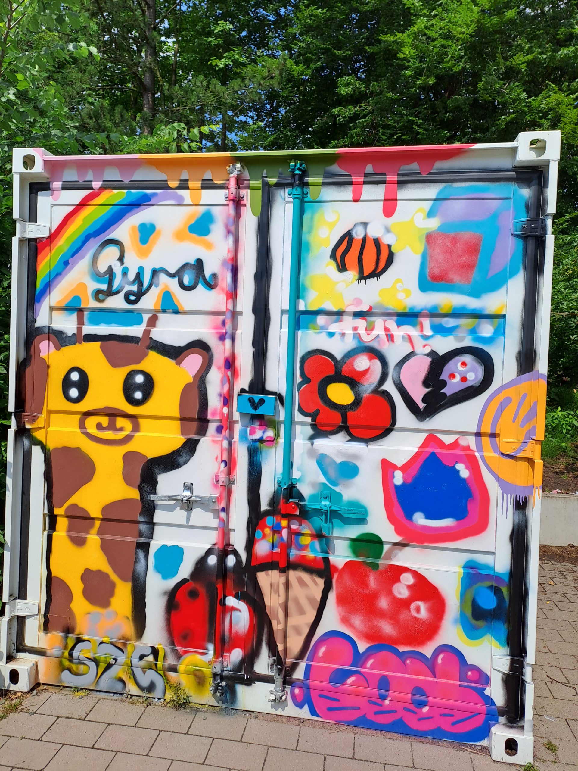 Eine große Gruppe von Schülerinnen und Schülern steht vor dem Gebäude des Sprungraums. Sie posieren gemeinsam für ein Foto auf einer Treppe, während sie lächeln und die Hände heben. Im Hintergrund sind bunte Plakate und das Logo des Sprungraums sichtbar. Die Szene vermittelt eine fröhliche und energiegeladene Atmosphäre. Graffiti auf einer Wand mit einem stilisierten Gesicht eines Jungen, der schwarze Haare hat und einen neugierigen Ausdruck zeigt. Um das Gesicht herum sind bunte Farben und weitere grafische Elemente, darunter grüne und blaue Formen. Der Schriftzug Bunt bemalter Container mit verschiedenen Graffiti-Motiven, darunter cartoonartige Figuren und farbige Symbole, umgeben von grünen Bäumen und Sträuchern in einer hellen, sonnigen Umgebung. Bunt bemalte Container-Türen mit einem großen, lächelnden Giraffenmotiv, einem Regenbogen, Blumen, Herzen und anderen farbenfrohen Mustern. Der Name