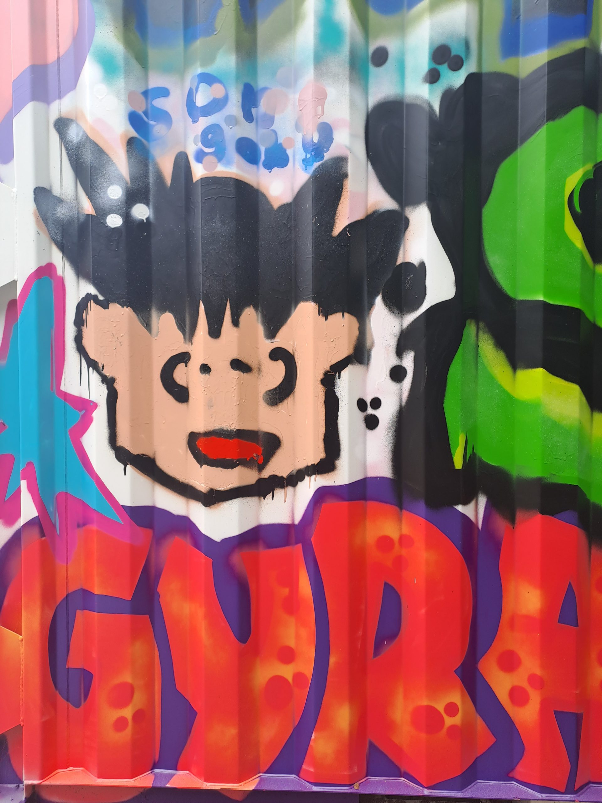 Eine große Gruppe von Schülerinnen und Schülern steht vor dem Gebäude des Sprungraums. Sie posieren gemeinsam für ein Foto auf einer Treppe, während sie lächeln und die Hände heben. Im Hintergrund sind bunte Plakate und das Logo des Sprungraums sichtbar. Die Szene vermittelt eine fröhliche und energiegeladene Atmosphäre. Graffiti auf einer Wand mit einem stilisierten Gesicht eines Jungen, der schwarze Haare hat und einen neugierigen Ausdruck zeigt. Um das Gesicht herum sind bunte Farben und weitere grafische Elemente, darunter grüne und blaue Formen. Der Schriftzug Bunt bemalter Container mit verschiedenen Graffiti-Motiven, darunter cartoonartige Figuren und farbige Symbole, umgeben von grünen Bäumen und Sträuchern in einer hellen, sonnigen Umgebung. Bunt bemalte Container-Türen mit einem großen, lächelnden Giraffenmotiv, einem Regenbogen, Blumen, Herzen und anderen farbenfrohen Mustern. Der Name