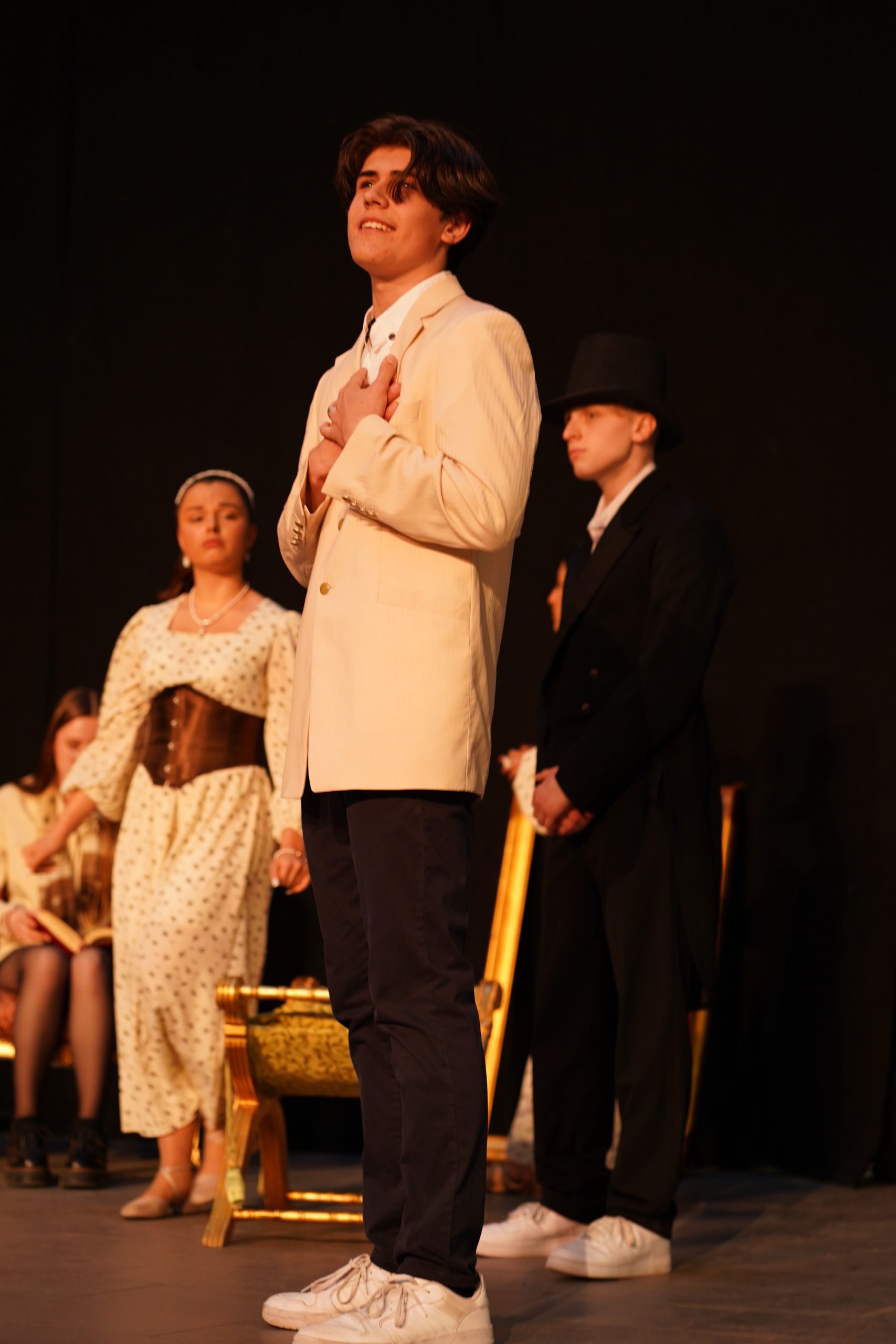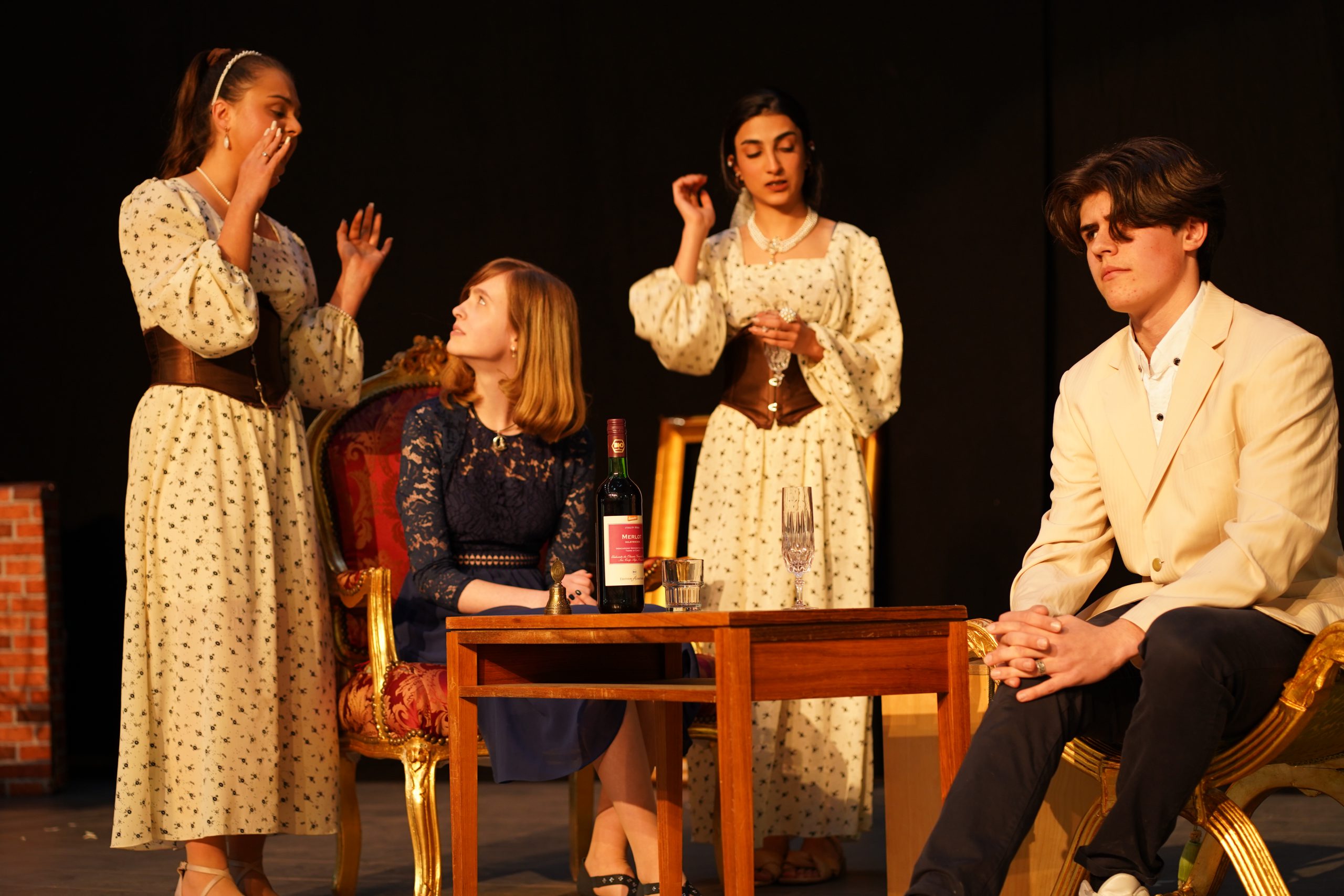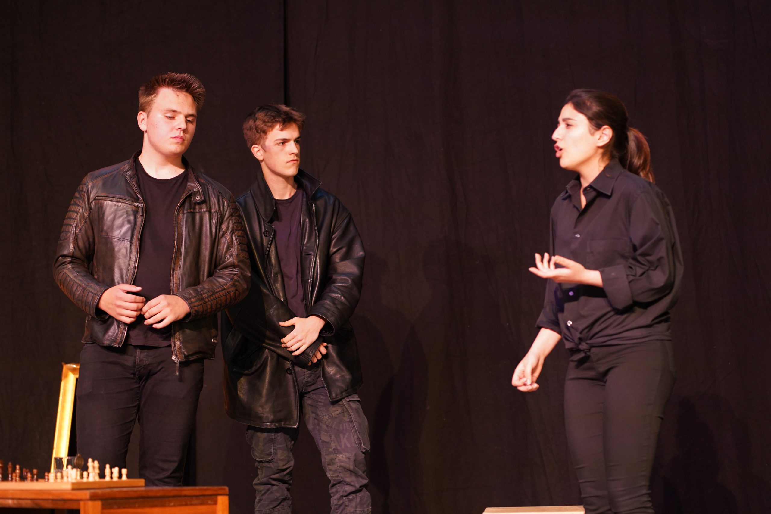 Zwei Schauspielerinnen stehen auf einer Theaterbühne. Die linke Schauspielerin hält ein Clipboard, während die rechte Schauspielerin ein Blatt Papier in der Hand hat und gestikuliert. Im Hintergrund sind einige Requisiten wie ein Stuhl und ein Tisch zu sehen. Die Bühne ist schwach beleuchtet, der Fokus liegt auf den beiden Frauen. Drei Schauspielerinnen in historischen Kostümen stehen auf einer Theaterbühne. Eine von ihnen trägt ein blaues Kleid und spricht mit den anderen beiden, die weiße Kleider tragen. Im Hintergrund sind Requisiten und Möbel sichtbar. Die Szene vermittelt eine dramatische Atmosphäre. Szenenbild aus einem Theaterstück: Eine Gruppe von fünf Schauspielern auf der Bühne. Ein junger Mann sitzt auf einem goldenen Stuhl, während eine junge Frau ihm gegenüber sitzt. Eine weitere Frau steht daneben, und zwei Personen stehen im Hintergrund, eine mit einem langen Kleid und eine im Anzug mit Zylinder. Im Hintergrund sind ein Kamin und ein Tisch mit Kerzen und einer Flasche zu sehen. Die Beleuchtung ist auf die Schauspieler gerichtet. Aufführung auf einer Bühne mit mehreren Schauspielern. Ein junger Mann in einem hellen Anzug steht im Vordergrund und deutet mit der Hand auf seine Brust. Eine weitere Schauspielerin in einem weißen Kleid und einem braunen Gürtel steht links hinter ihm. Im Hintergrund ist ein weiterer Schauspieler in schwarzer Kleidung und Hut zu sehen. Die Szene spielt in einem Theaterrraum mit dunklem Hintergrund. Drei Schauspieler auf einer Bühne: Eine Frau in einem hellen Outfit mit einem Buch in der Hand spricht zu einem jungen Mann in einem weißen Anzug, während ein weiterer junger Mann in einem schwarzen Anzug und einem Zylinder im Hintergrund steht. Der Hintergrund ist dunkel, was die Schauspieler hervorhebt. Ein junger Mann mit lockigem Haar trägt ein weißes Hemd und hellblaue Jeans. Er hält eine Blume in der Hand und geht auf einer Bühne mit schwarzem Hintergrund. Drei Personen auf einer Bühne während einer Theatervorstellung. Zwei Personen stehen am Tisch mit einem Schachspiel: eine junge Frau in schwarzer Kleidung und ein junger Mann in einer Lederjacke, der eine Schachfigur in der Hand hält. Im Hintergrund sitzt eine weitere Person, die entspannt auf einem Stuhl sitzt. Der Hintergrund ist dunkel, was die Bühne hervorhebt. Ein junger Mann sitzt auf dem Boden und hält einen Gegenstand in der Hand. Er trägt eine schwarze Lederjacke und hat kurze, braune Haare. Im Hintergrund sind andere Personen zu sehen, die ebenfalls auf einer Bühne sitzen. Die Szene vermittelt eine künstlerische Atmosphäre. Ein junger Mann steht auf einer Bühne, trägt ein weißes Hemd und Jeans. Er hat eine Rose in der Hand und schaut nachdenklich. Im Hintergrund sind Pflanzen und beschriftete Schilder mit den Worten „OBST“, „FISCH“ und „BROT“ zu sehen. Die Bühne hat eine Backsteinwand und eine mit Rosen dekorierte Fläche. Drei Schauspieler auf einer Bühne: Zwei Männer in schwarzen Lederjacken stehen nebeneinander und schauen aufmerksam zu einer Frau, die in schwarzer Kleidung spricht und gestikuliert. Im Hintergrund ist ein schwarzer Vorhang sichtbar. Auf einem Tisch neben ihnen steht ein Schachspiel. Drei Schauspieler auf einer Bühne führen eine Szene auf. Zwei Männer, einer in einer Lederjacke, interagieren mit einer Frau, die in schwarz gekleidet ist. Der Hintergrund ist schwarz, was die Aufmerksamkeit auf die Darsteller lenkt. Drei Schauspielerinnen in historischen Kleidern stehen und sitzen um einen Tisch auf einer Theaterbühne. Eine Frau mit langen Haaren, die in einem blauen Kleid sitzt, schaut aufmerksam auf die anderen. Eine Schauspielerin im hellen Kleid hat die Hände in die Höhe gestreckt, während eine andere mit nachdenklichem Gesichtsausdruck daneben steht. Ein junger Mann in einem hellen Anzug sitzt entspannt auf einem Stuhl und beobachtet die Szene. Auf dem Tisch steht eine Flasche Wein und ein Glas. Der Hintergrund ist dunkel, was die Charaktere hervorhebt. Drei Schauspielerinnen auf einer Theaterbühne in einem inszenierten Stück. Eine Schauspielerin trägt ein langes, dunkles Kleid und steht im Mittelpunkt, während die anderen beiden in hellen, gepunkteten Kleidern auf beiden Seiten stehen. Im Hintergrund sind ein roter Sessel und einige Requisiten sichtbar. Die Szene vermittelt eine dramatische Atmosphäre. Vier Personen stehen auf einer Bühne. Eine Person sitzt auf einem Stuhl, während die anderen drei stehen. Die sitzende Person trägt einen weißen Umhang und hat lange, dunkle Haare. Die Umgebungsdekoration umfasst Pflanzen und eine Wand mit Schriftzügen wie Zwei Schauspielerinnen auf einer Bühne in einem Theater. Die linke Frau trägt einen schwarzen Umhang und schaut die andere an, die rechts steht. Diese hat lange, braune Haare und hält einen Blumenstrauß in der Hand. Im Hintergrund sind Möbel wie ein rotes Sofa und ein Tisch mit Kerzen zu sehen. Eine Frau in einem schwarzen Kleid und einer weißen Haube kniet auf dem Boden und hält ein Buch in der Hand. Vor ihr stehen zwei kleine Kerzen. Der Hintergrund ist dunkel. Zwei Schauspielerinnen stehen auf einer Bühne. Eine von ihnen trägt eine Brille und einen schwarzen Hut und lächelt, während sie die Hände zusammenführt. Die andere Schauspielerin steht neben ihr, trägt ebenfalls einen schwarzen Hut und eine schwarze Jacke. Im Hintergrund sind Pflanzen und beschriftete Schilder sichtbar. Vier Schauspielerinnen stehen auf einer Bühne. Eine von ihnen hält einen goldenen Bilderrahmen, während die anderen in verschiedenen Posen stehen. Im Hintergrund sind Requisiten wie ein Tisch und einige liegende Personen sichtbar. Die Szene vermittelt eine theatrale Atmosphäre. Eine Theateraufführung auf einer Bühnenbühne. Vier Schauspieler in unterschiedlichen Kostümen interagieren miteinander. Eine Person hält einen Bilderrahmen, während die anderen in verschiedenen Posen stehen. Im Hintergrund sind Requisiten und andere Darsteller zu sehen. Ei