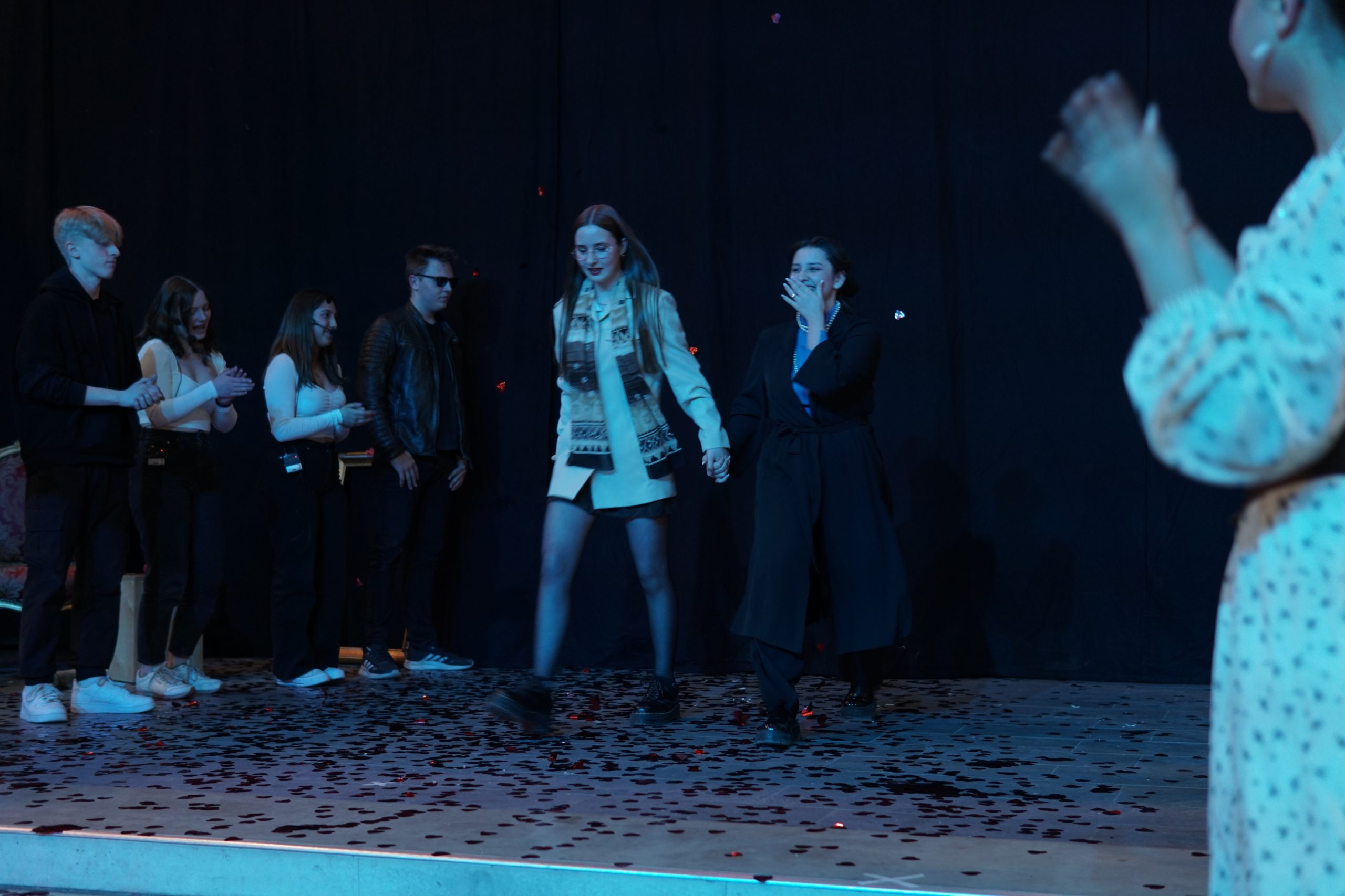 Durch den Einsatz der Regisseurinnen entsteht immer wieder der Eindruck, dass dies alles ein Spiel sei, dessen Fäden nur geschickt gelenkt werden müssen. Aber auch in dieser humorvollen Version des Klassikers endet das Spiel für die Hauptrollen tragisch. Dass es dennoch ein Happy End gibt, ist den Müttern zu verdanken: Es sind Lady Montague und Lady Capulet, welche die ganze Zeit ihre Liebe zueinander verheimlichen, in schwachen Momenten über ihre Ängste und Sorgen reden, sich gegenseitig aber immer wieder an die bestehende Familienfehde erinnern, um ja nicht aufzufallen in all dem Theater. Erst mit dem Tod ihrer Kinder ist es ihnen möglich, öffentlich zu ihrer Liebe zu stehen. Und so antwortet ein amüsanter, luftig-leichter Theaterabend, den die Darsteller mit viel Spielfreude und Witz dem Publikum dargeboten haben, mit dem Song „I kissed a girl“ von Kate Perry und reichlich rotem Herzchen-Lametta auf die eingangs gestellte Frage: Ja, ich glaube an die wahre Liebe!