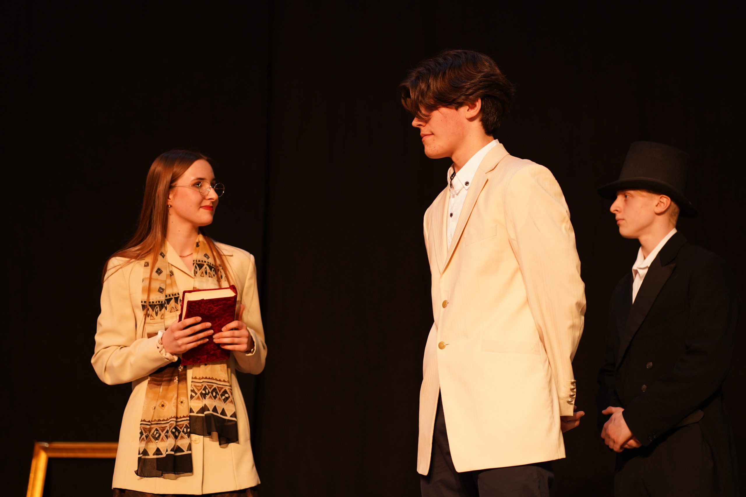 Zwei Schauspielerinnen stehen auf einer Theaterbühne. Die linke Schauspielerin hält ein Clipboard, während die rechte Schauspielerin ein Blatt Papier in der Hand hat und gestikuliert. Im Hintergrund sind einige Requisiten wie ein Stuhl und ein Tisch zu sehen. Die Bühne ist schwach beleuchtet, der Fokus liegt auf den beiden Frauen. Drei Schauspielerinnen in historischen Kostümen stehen auf einer Theaterbühne. Eine von ihnen trägt ein blaues Kleid und spricht mit den anderen beiden, die weiße Kleider tragen. Im Hintergrund sind Requisiten und Möbel sichtbar. Die Szene vermittelt eine dramatische Atmosphäre. Szenenbild aus einem Theaterstück: Eine Gruppe von fünf Schauspielern auf der Bühne. Ein junger Mann sitzt auf einem goldenen Stuhl, während eine junge Frau ihm gegenüber sitzt. Eine weitere Frau steht daneben, und zwei Personen stehen im Hintergrund, eine mit einem langen Kleid und eine im Anzug mit Zylinder. Im Hintergrund sind ein Kamin und ein Tisch mit Kerzen und einer Flasche zu sehen. Die Beleuchtung ist auf die Schauspieler gerichtet. Aufführung auf einer Bühne mit mehreren Schauspielern. Ein junger Mann in einem hellen Anzug steht im Vordergrund und deutet mit der Hand auf seine Brust. Eine weitere Schauspielerin in einem weißen Kleid und einem braunen Gürtel steht links hinter ihm. Im Hintergrund ist ein weiterer Schauspieler in schwarzer Kleidung und Hut zu sehen. Die Szene spielt in einem Theaterrraum mit dunklem Hintergrund. Drei Schauspieler auf einer Bühne: Eine Frau in einem hellen Outfit mit einem Buch in der Hand spricht zu einem jungen Mann in einem weißen Anzug, während ein weiterer junger Mann in einem schwarzen Anzug und einem Zylinder im Hintergrund steht. Der Hintergrund ist dunkel, was die Schauspieler hervorhebt. Ein junger Mann mit lockigem Haar trägt ein weißes Hemd und hellblaue Jeans. Er hält eine Blume in der Hand und geht auf einer Bühne mit schwarzem Hintergrund. Drei Personen auf einer Bühne während einer Theatervorstellung. Zwei Personen stehen am Tisch mit einem Schachspiel: eine junge Frau in schwarzer Kleidung und ein junger Mann in einer Lederjacke, der eine Schachfigur in der Hand hält. Im Hintergrund sitzt eine weitere Person, die entspannt auf einem Stuhl sitzt. Der Hintergrund ist dunkel, was die Bühne hervorhebt. Ein junger Mann sitzt auf dem Boden und hält einen Gegenstand in der Hand. Er trägt eine schwarze Lederjacke und hat kurze, braune Haare. Im Hintergrund sind andere Personen zu sehen, die ebenfalls auf einer Bühne sitzen. Die Szene vermittelt eine künstlerische Atmosphäre. Ein junger Mann steht auf einer Bühne, trägt ein weißes Hemd und Jeans. Er hat eine Rose in der Hand und schaut nachdenklich. Im Hintergrund sind Pflanzen und beschriftete Schilder mit den Worten „OBST“, „FISCH“ und „BROT“ zu sehen. Die Bühne hat eine Backsteinwand und eine mit Rosen dekorierte Fläche. Drei Schauspieler auf einer Bühne: Zwei Männer in schwarzen Lederjacken stehen nebeneinander und schauen aufmerksam zu einer Frau, die in schwarzer Kleidung spricht und gestikuliert. Im Hintergrund ist ein schwarzer Vorhang sichtbar. Auf einem Tisch neben ihnen steht ein Schachspiel. Drei Schauspieler auf einer Bühne führen eine Szene auf. Zwei Männer, einer in einer Lederjacke, interagieren mit einer Frau, die in schwarz gekleidet ist. Der Hintergrund ist schwarz, was die Aufmerksamkeit auf die Darsteller lenkt. Drei Schauspielerinnen in historischen Kleidern stehen und sitzen um einen Tisch auf einer Theaterbühne. Eine Frau mit langen Haaren, die in einem blauen Kleid sitzt, schaut aufmerksam auf die anderen. Eine Schauspielerin im hellen Kleid hat die Hände in die Höhe gestreckt, während eine andere mit nachdenklichem Gesichtsausdruck daneben steht. Ein junger Mann in einem hellen Anzug sitzt entspannt auf einem Stuhl und beobachtet die Szene. Auf dem Tisch steht eine Flasche Wein und ein Glas. Der Hintergrund ist dunkel, was die Charaktere hervorhebt. Drei Schauspielerinnen auf einer Theaterbühne in einem inszenierten Stück. Eine Schauspielerin trägt ein langes, dunkles Kleid und steht im Mittelpunkt, während die anderen beiden in hellen, gepunkteten Kleidern auf beiden Seiten stehen. Im Hintergrund sind ein roter Sessel und einige Requisiten sichtbar. Die Szene vermittelt eine dramatische Atmosphäre. Vier Personen stehen auf einer Bühne. Eine Person sitzt auf einem Stuhl, während die anderen drei stehen. Die sitzende Person trägt einen weißen Umhang und hat lange, dunkle Haare. Die Umgebungsdekoration umfasst Pflanzen und eine Wand mit Schriftzügen wie Zwei Schauspielerinnen auf einer Bühne in einem Theater. Die linke Frau trägt einen schwarzen Umhang und schaut die andere an, die rechts steht. Diese hat lange, braune Haare und hält einen Blumenstrauß in der Hand. Im Hintergrund sind Möbel wie ein rotes Sofa und ein Tisch mit Kerzen zu sehen. Eine Frau in einem schwarzen Kleid und einer weißen Haube kniet auf dem Boden und hält ein Buch in der Hand. Vor ihr stehen zwei kleine Kerzen. Der Hintergrund ist dunkel. Zwei Schauspielerinnen stehen auf einer Bühne. Eine von ihnen trägt eine Brille und einen schwarzen Hut und lächelt, während sie die Hände zusammenführt. Die andere Schauspielerin steht neben ihr, trägt ebenfalls einen schwarzen Hut und eine schwarze Jacke. Im Hintergrund sind Pflanzen und beschriftete Schilder sichtbar. Vier Schauspielerinnen stehen auf einer Bühne. Eine von ihnen hält einen goldenen Bilderrahmen, während die anderen in verschiedenen Posen stehen. Im Hintergrund sind Requisiten wie ein Tisch und einige liegende Personen sichtbar. Die Szene vermittelt eine theatrale Atmosphäre. Eine Theateraufführung auf einer Bühnenbühne. Vier Schauspieler in unterschiedlichen Kostümen interagieren miteinander. Eine Person hält einen Bilderrahmen, während die anderen in verschiedenen Posen stehen. Im Hintergrund sind Requisiten und andere Darsteller zu sehen. Ei