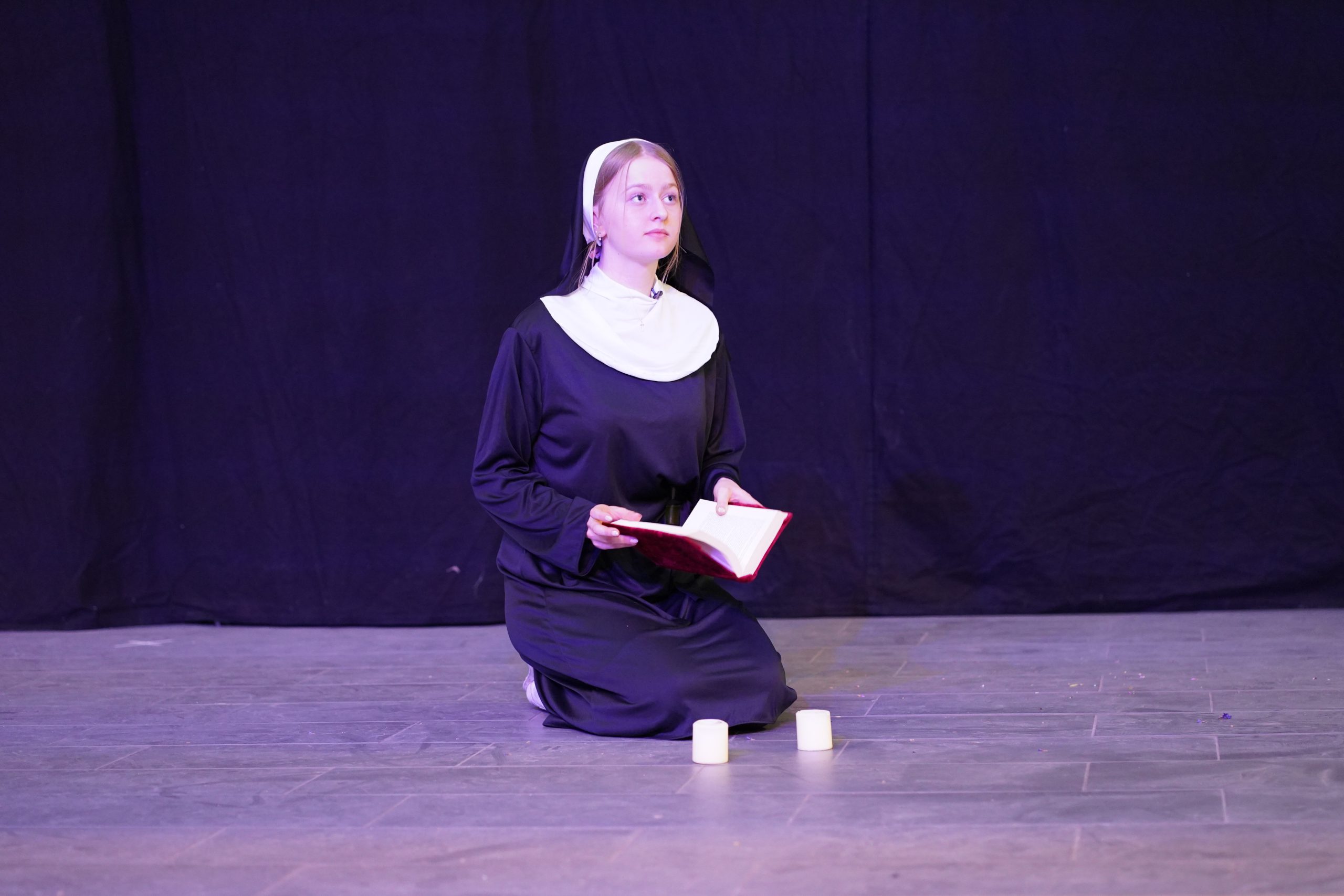 Zwei Schauspielerinnen stehen auf einer Theaterbühne. Die linke Schauspielerin hält ein Clipboard, während die rechte Schauspielerin ein Blatt Papier in der Hand hat und gestikuliert. Im Hintergrund sind einige Requisiten wie ein Stuhl und ein Tisch zu sehen. Die Bühne ist schwach beleuchtet, der Fokus liegt auf den beiden Frauen. Drei Schauspielerinnen in historischen Kostümen stehen auf einer Theaterbühne. Eine von ihnen trägt ein blaues Kleid und spricht mit den anderen beiden, die weiße Kleider tragen. Im Hintergrund sind Requisiten und Möbel sichtbar. Die Szene vermittelt eine dramatische Atmosphäre. Szenenbild aus einem Theaterstück: Eine Gruppe von fünf Schauspielern auf der Bühne. Ein junger Mann sitzt auf einem goldenen Stuhl, während eine junge Frau ihm gegenüber sitzt. Eine weitere Frau steht daneben, und zwei Personen stehen im Hintergrund, eine mit einem langen Kleid und eine im Anzug mit Zylinder. Im Hintergrund sind ein Kamin und ein Tisch mit Kerzen und einer Flasche zu sehen. Die Beleuchtung ist auf die Schauspieler gerichtet. Aufführung auf einer Bühne mit mehreren Schauspielern. Ein junger Mann in einem hellen Anzug steht im Vordergrund und deutet mit der Hand auf seine Brust. Eine weitere Schauspielerin in einem weißen Kleid und einem braunen Gürtel steht links hinter ihm. Im Hintergrund ist ein weiterer Schauspieler in schwarzer Kleidung und Hut zu sehen. Die Szene spielt in einem Theaterrraum mit dunklem Hintergrund. Drei Schauspieler auf einer Bühne: Eine Frau in einem hellen Outfit mit einem Buch in der Hand spricht zu einem jungen Mann in einem weißen Anzug, während ein weiterer junger Mann in einem schwarzen Anzug und einem Zylinder im Hintergrund steht. Der Hintergrund ist dunkel, was die Schauspieler hervorhebt. Ein junger Mann mit lockigem Haar trägt ein weißes Hemd und hellblaue Jeans. Er hält eine Blume in der Hand und geht auf einer Bühne mit schwarzem Hintergrund. Drei Personen auf einer Bühne während einer Theatervorstellung. Zwei Personen stehen am Tisch mit einem Schachspiel: eine junge Frau in schwarzer Kleidung und ein junger Mann in einer Lederjacke, der eine Schachfigur in der Hand hält. Im Hintergrund sitzt eine weitere Person, die entspannt auf einem Stuhl sitzt. Der Hintergrund ist dunkel, was die Bühne hervorhebt. Ein junger Mann sitzt auf dem Boden und hält einen Gegenstand in der Hand. Er trägt eine schwarze Lederjacke und hat kurze, braune Haare. Im Hintergrund sind andere Personen zu sehen, die ebenfalls auf einer Bühne sitzen. Die Szene vermittelt eine künstlerische Atmosphäre. Ein junger Mann steht auf einer Bühne, trägt ein weißes Hemd und Jeans. Er hat eine Rose in der Hand und schaut nachdenklich. Im Hintergrund sind Pflanzen und beschriftete Schilder mit den Worten „OBST“, „FISCH“ und „BROT“ zu sehen. Die Bühne hat eine Backsteinwand und eine mit Rosen dekorierte Fläche. Drei Schauspieler auf einer Bühne: Zwei Männer in schwarzen Lederjacken stehen nebeneinander und schauen aufmerksam zu einer Frau, die in schwarzer Kleidung spricht und gestikuliert. Im Hintergrund ist ein schwarzer Vorhang sichtbar. Auf einem Tisch neben ihnen steht ein Schachspiel. Drei Schauspieler auf einer Bühne führen eine Szene auf. Zwei Männer, einer in einer Lederjacke, interagieren mit einer Frau, die in schwarz gekleidet ist. Der Hintergrund ist schwarz, was die Aufmerksamkeit auf die Darsteller lenkt. Drei Schauspielerinnen in historischen Kleidern stehen und sitzen um einen Tisch auf einer Theaterbühne. Eine Frau mit langen Haaren, die in einem blauen Kleid sitzt, schaut aufmerksam auf die anderen. Eine Schauspielerin im hellen Kleid hat die Hände in die Höhe gestreckt, während eine andere mit nachdenklichem Gesichtsausdruck daneben steht. Ein junger Mann in einem hellen Anzug sitzt entspannt auf einem Stuhl und beobachtet die Szene. Auf dem Tisch steht eine Flasche Wein und ein Glas. Der Hintergrund ist dunkel, was die Charaktere hervorhebt. Drei Schauspielerinnen auf einer Theaterbühne in einem inszenierten Stück. Eine Schauspielerin trägt ein langes, dunkles Kleid und steht im Mittelpunkt, während die anderen beiden in hellen, gepunkteten Kleidern auf beiden Seiten stehen. Im Hintergrund sind ein roter Sessel und einige Requisiten sichtbar. Die Szene vermittelt eine dramatische Atmosphäre. Vier Personen stehen auf einer Bühne. Eine Person sitzt auf einem Stuhl, während die anderen drei stehen. Die sitzende Person trägt einen weißen Umhang und hat lange, dunkle Haare. Die Umgebungsdekoration umfasst Pflanzen und eine Wand mit Schriftzügen wie Zwei Schauspielerinnen auf einer Bühne in einem Theater. Die linke Frau trägt einen schwarzen Umhang und schaut die andere an, die rechts steht. Diese hat lange, braune Haare und hält einen Blumenstrauß in der Hand. Im Hintergrund sind Möbel wie ein rotes Sofa und ein Tisch mit Kerzen zu sehen. Eine Frau in einem schwarzen Kleid und einer weißen Haube kniet auf dem Boden und hält ein Buch in der Hand. Vor ihr stehen zwei kleine Kerzen. Der Hintergrund ist dunkel. Zwei Schauspielerinnen stehen auf einer Bühne. Eine von ihnen trägt eine Brille und einen schwarzen Hut und lächelt, während sie die Hände zusammenführt. Die andere Schauspielerin steht neben ihr, trägt ebenfalls einen schwarzen Hut und eine schwarze Jacke. Im Hintergrund sind Pflanzen und beschriftete Schilder sichtbar. Vier Schauspielerinnen stehen auf einer Bühne. Eine von ihnen hält einen goldenen Bilderrahmen, während die anderen in verschiedenen Posen stehen. Im Hintergrund sind Requisiten wie ein Tisch und einige liegende Personen sichtbar. Die Szene vermittelt eine theatrale Atmosphäre. Eine Theateraufführung auf einer Bühnenbühne. Vier Schauspieler in unterschiedlichen Kostümen interagieren miteinander. Eine Person hält einen Bilderrahmen, während die anderen in verschiedenen Posen stehen. Im Hintergrund sind Requisiten und andere Darsteller zu sehen. Ei