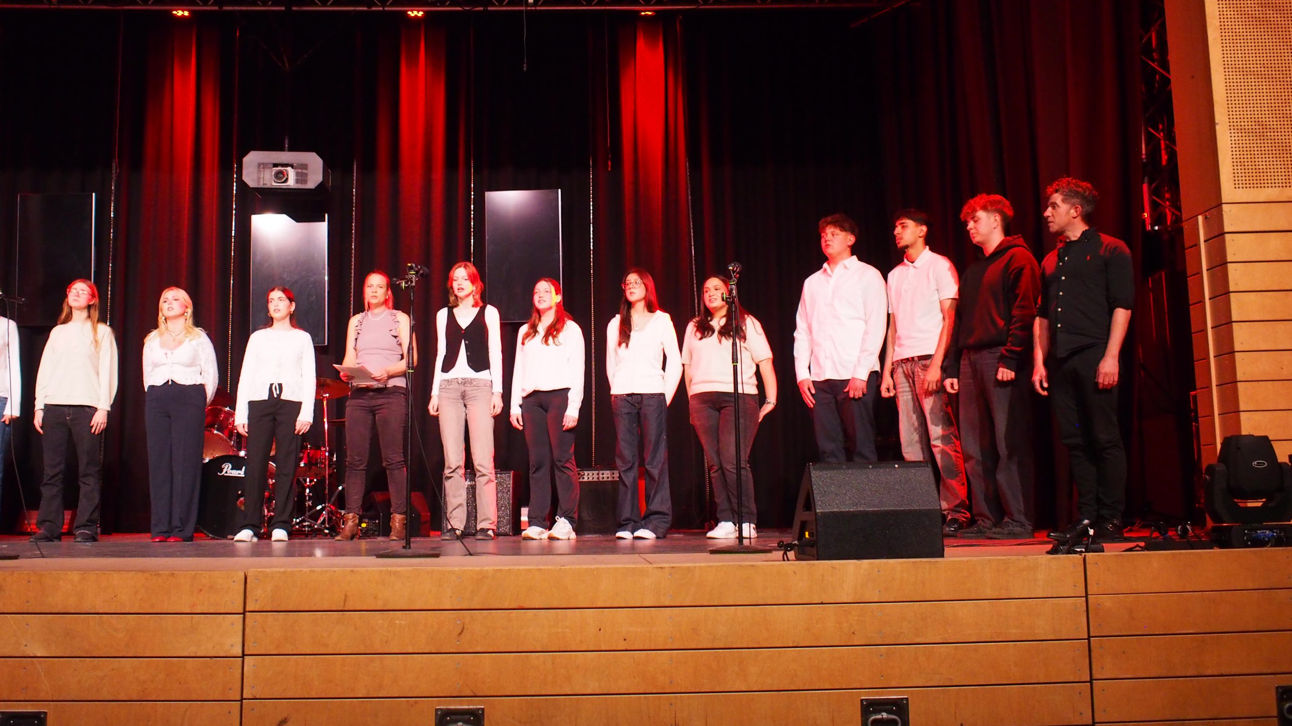 Unsere neue Kollegin Maja Kemper, die seit Februar bei uns Musik und Französisch unterrichtet, unterstützte bei Bedarf die einzelnen Ensembles gesanglich oder instrumental. Die Tanz-AG unter der Leitung von Kaila Bulanik führte uns beschwingt in die Pause, unterstützt durch besondere Lichteffekte des Technikteams. Im zweiten Teil überzeugte die Mittelstufenband von Herrn Lahann wie immer durch virtuoses Spiel und zauberhaften Gesang. Den festlichen Abschluss gestaltete der Oberstufenchor von Herrn Krösser.