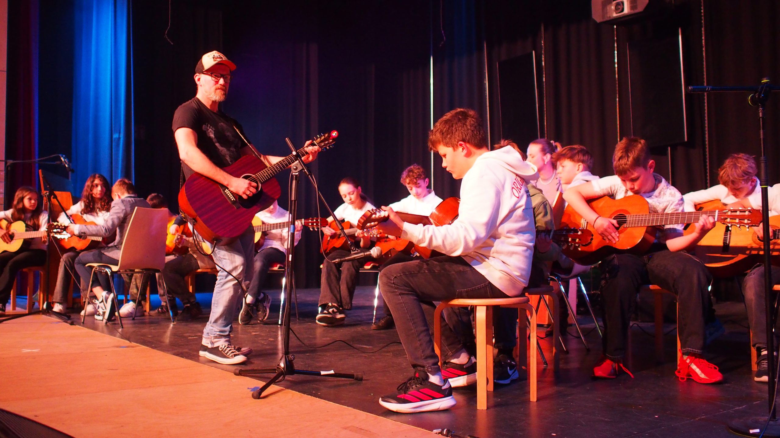 Unsere neue Kollegin Maja Kemper, die seit Februar bei uns Musik und Französisch unterrichtet, unterstützte bei Bedarf die einzelnen Ensembles gesanglich oder instrumental. Die Tanz-AG unter der Leitung von Kaila Bulanik führte uns beschwingt in die Pause, unterstützt durch besondere Lichteffekte des Technikteams. Im zweiten Teil überzeugte die Mittelstufenband von Herrn Lahann wie immer durch virtuoses Spiel und zauberhaften Gesang. Den festlichen Abschluss gestaltete der Oberstufenchor von Herrn Krösser.
