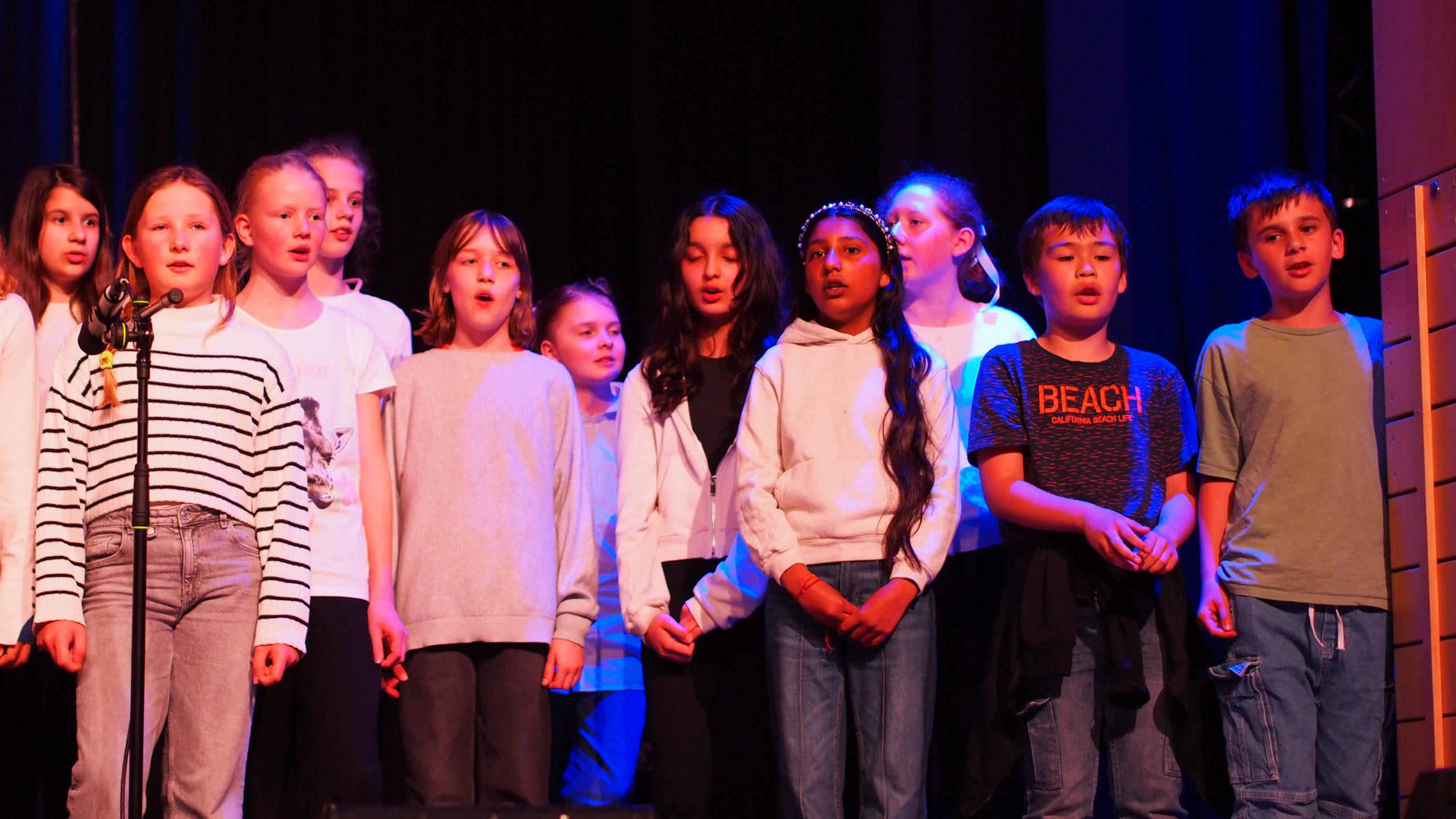 Unsere neue Kollegin Maja Kemper, die seit Februar bei uns Musik und Französisch unterrichtet, unterstützte bei Bedarf die einzelnen Ensembles gesanglich oder instrumental. Die Tanz-AG unter der Leitung von Kaila Bulanik führte uns beschwingt in die Pause, unterstützt durch besondere Lichteffekte des Technikteams. Im zweiten Teil überzeugte die Mittelstufenband von Herrn Lahann wie immer durch virtuoses Spiel und zauberhaften Gesang. Den festlichen Abschluss gestaltete der Oberstufenchor von Herrn Krösser.