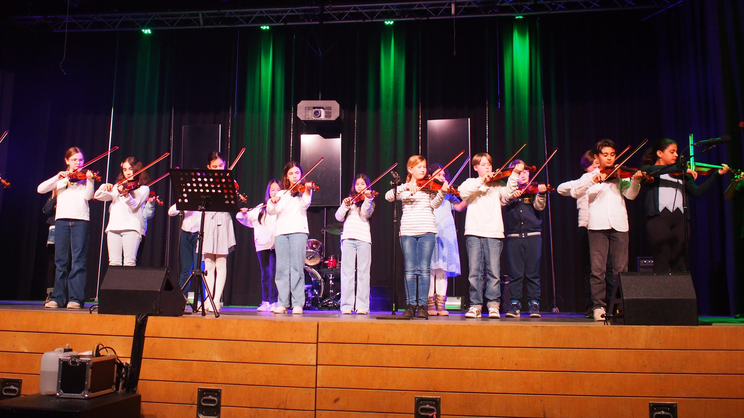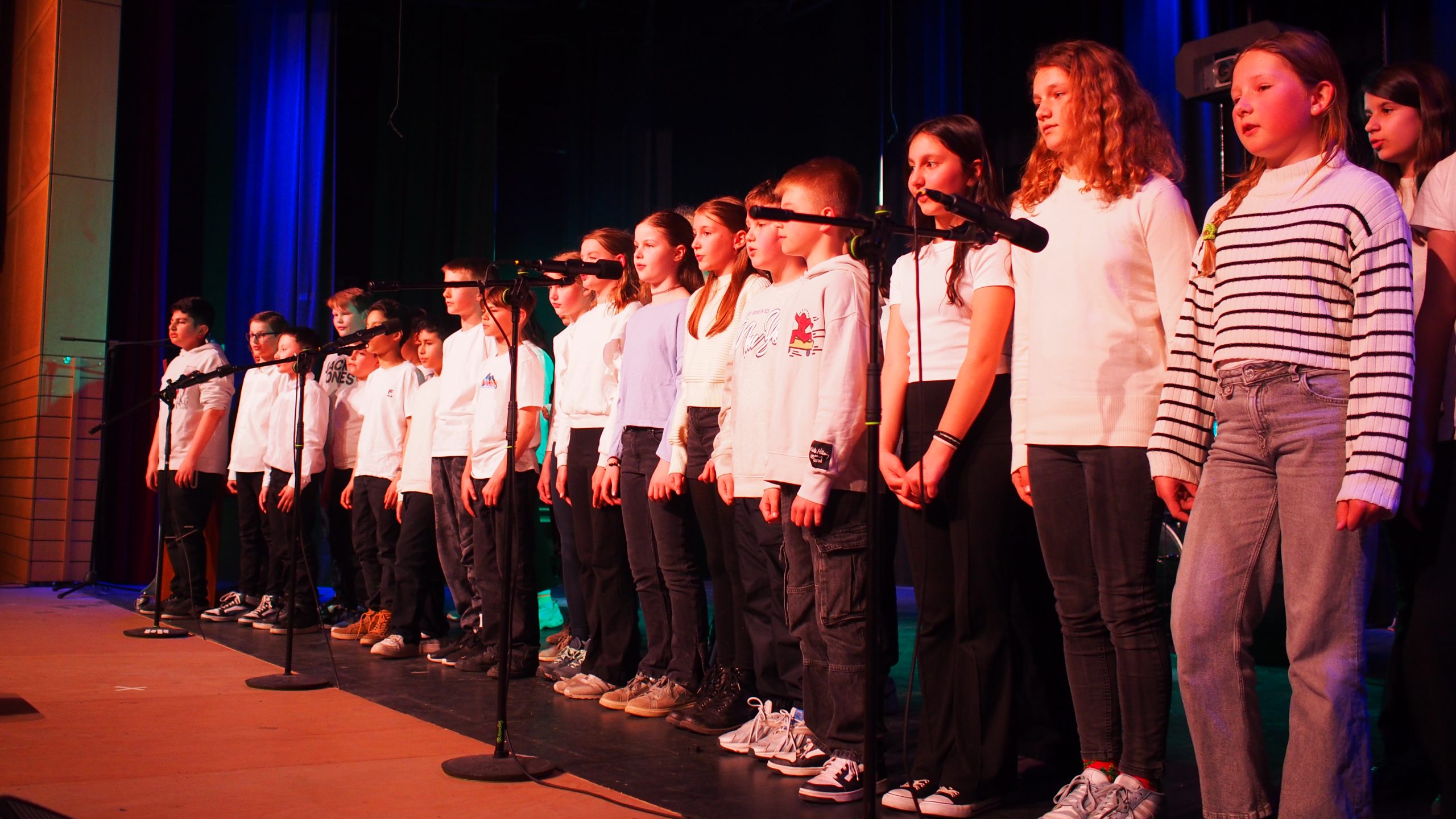 Unsere neue Kollegin Maja Kemper, die seit Februar bei uns Musik und Französisch unterrichtet, unterstützte bei Bedarf die einzelnen Ensembles gesanglich oder instrumental. Die Tanz-AG unter der Leitung von Kaila Bulanik führte uns beschwingt in die Pause, unterstützt durch besondere Lichteffekte des Technikteams. Im zweiten Teil überzeugte die Mittelstufenband von Herrn Lahann wie immer durch virtuoses Spiel und zauberhaften Gesang. Den festlichen Abschluss gestaltete der Oberstufenchor von Herrn Krösser.