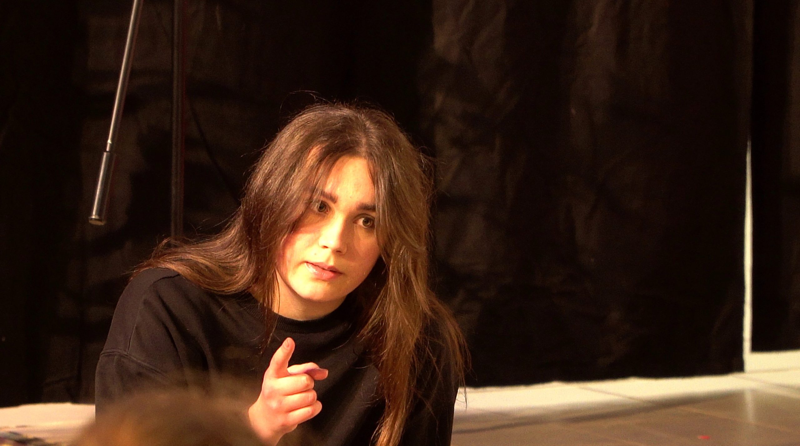 Im Verlauf des Stückes zieht sich ein dunkler Schatten durch das Atrium; eine Spielerin bewegt sich wie eine Wiedergängerin durch die Zuschauer; sie beobachtet und kommentiert, irgendwann greift sie in das Geschehen ein.