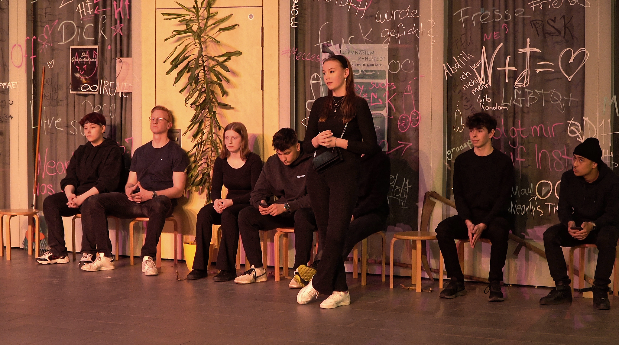 Das funktionale Bühnenbild mit der Steg-Konstruktion und den Graffitis sowie die Auftritte im oberen Bereich des Atriums erhöhen die Dynamik und zeigen auch im chorischen Spiel unterschiedliche Blickwinkel auf diese Jugend, die auch in eigenen Konflikten und Gruppenzwängen gefangen scheint. Ein Gong ruft immer wieder zu neuen Konstellationen auf – zeitliche Versatzstücke erfordern genaues Hinsehen.