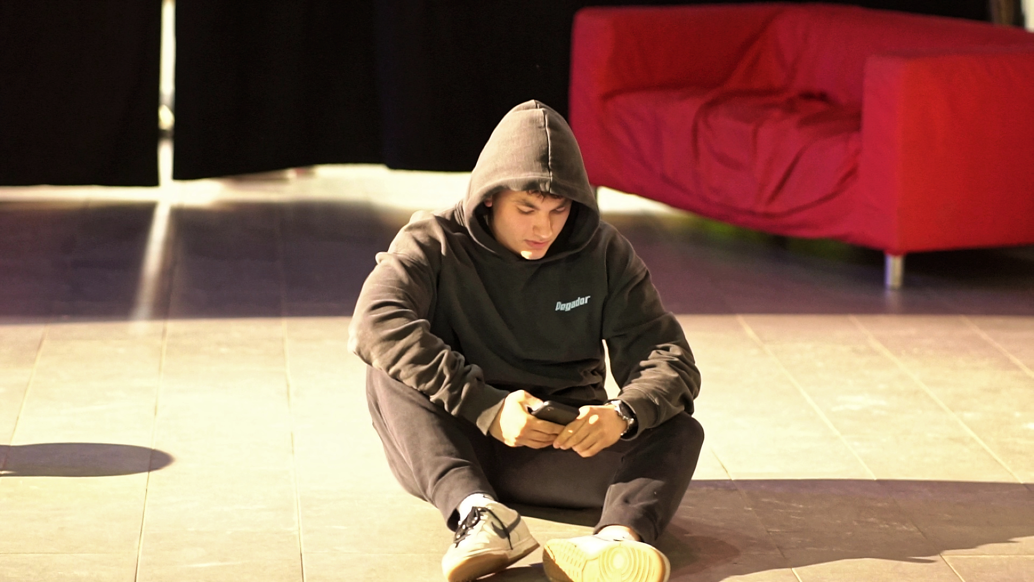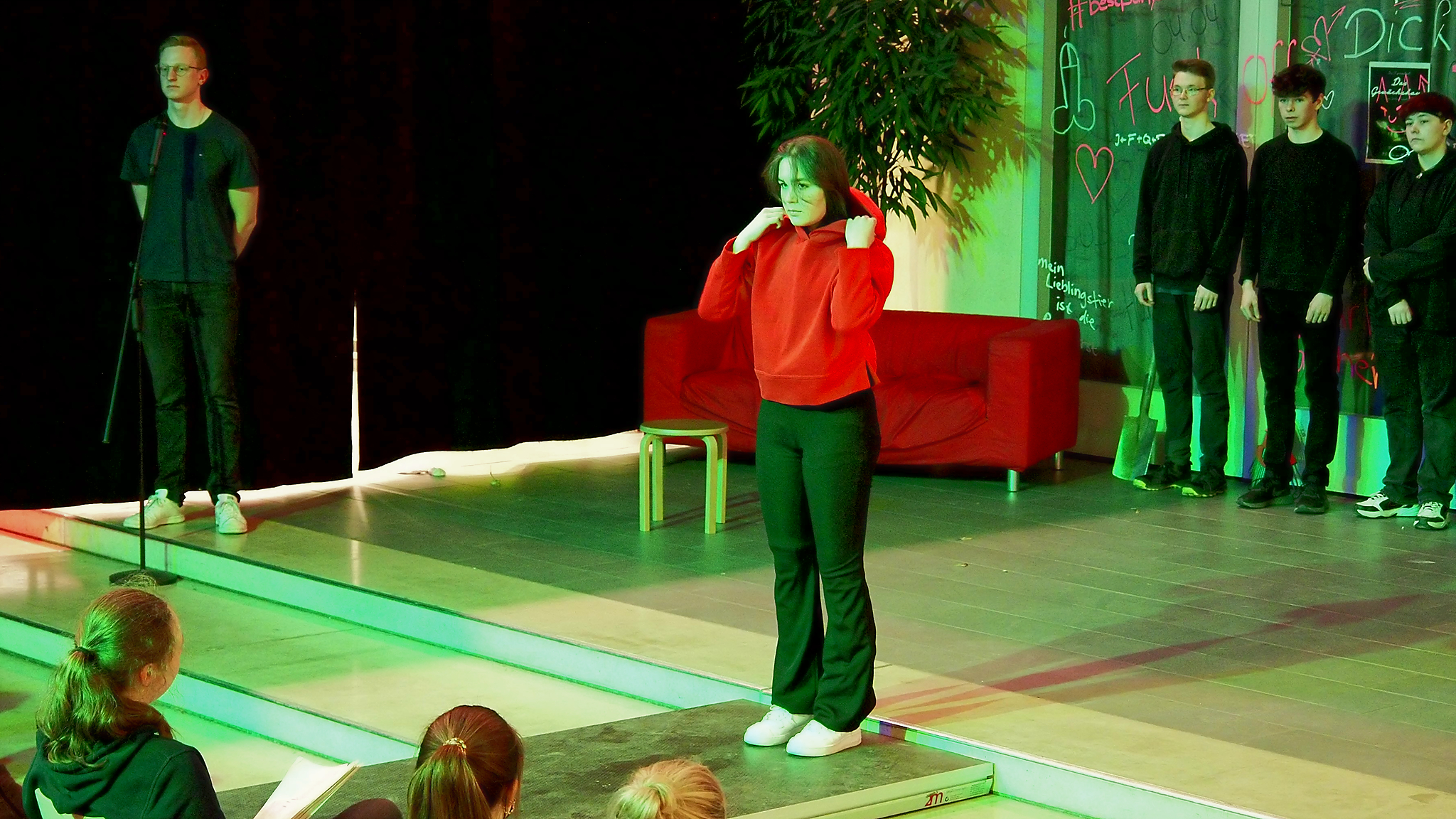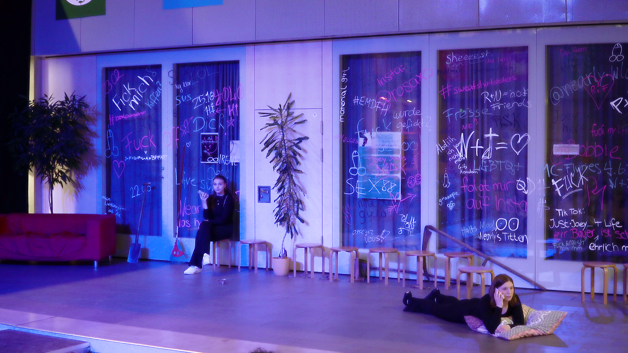 Das funktionale Bühnenbild mit der Steg-Konstruktion und den Graffitis sowie die Auftritte im oberen Bereich des Atriums erhöhen die Dynamik und zeigen auch im chorischen Spiel unterschiedliche Blickwinkel auf diese Jugend, die auch in eigenen Konflikten und Gruppenzwängen gefangen scheint. Ein Gong ruft immer wieder zu neuen Konstellationen auf – zeitliche Versatzstücke erfordern genaues Hinsehen.