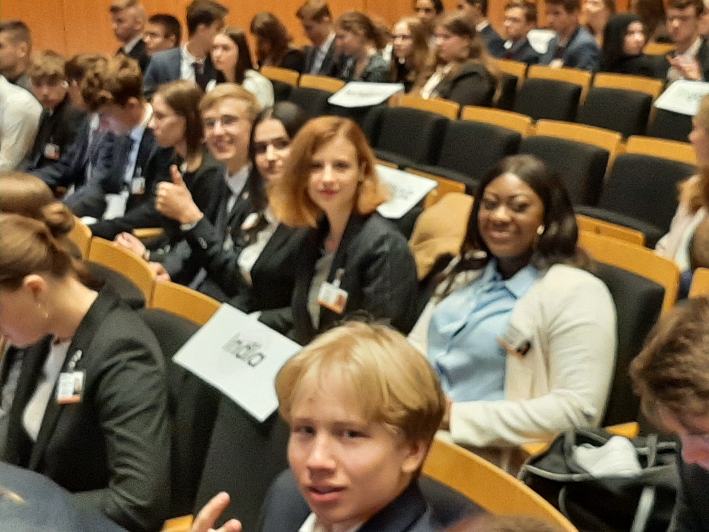 Eine Gruppe von jungen Menschen sitzt in einem Konferenzraum. Einige der Teilnehmer lächeln und zeigen mit den Händen, während sie auf Stühlen sitzen, die mit Namensschildern versehen sind. Die Anordnung der Sitze ist in Reihen, und im Hintergrund sind weitere Teilnehmer sichtbar. Alle tragen formelle Kleidung.