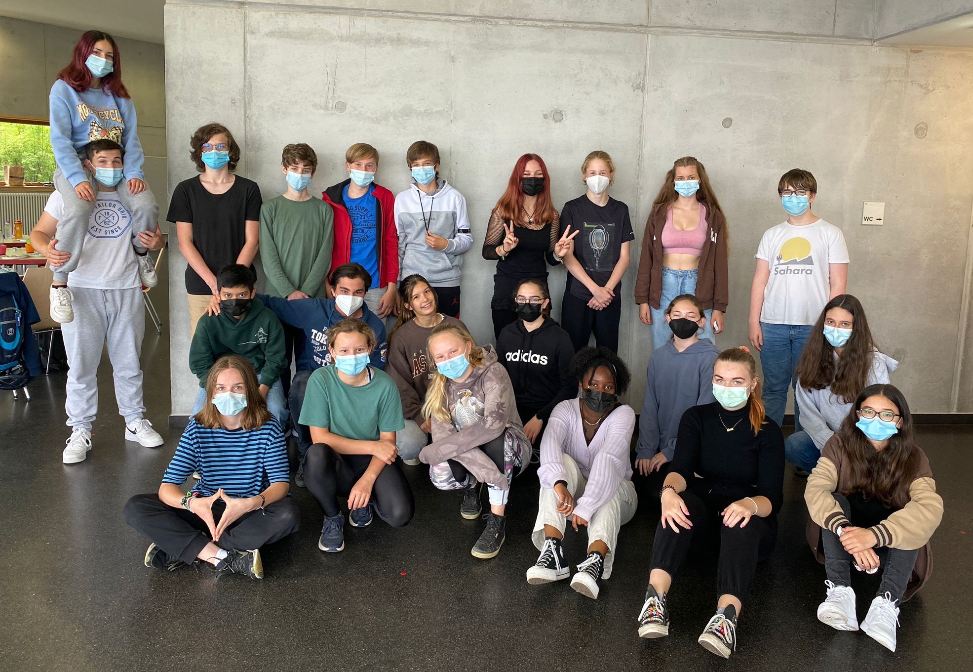 Gruppe von jungen Menschen, die in einem Raum mit grauen Wänden stehen und sitzen. Alle tragen Mund-Nasen-Schutzmasken. Die Gruppe lächelt und posiert freundlich für das Foto. Es sind insgesamt 24 Personen, darunter sowohl Jungen als auch Mädchen, in unterschiedlichen Kleidungstilen.links n. rechts, obere Reihe: Vici, Nikita, Pépe, Henrik, Jannes, Ole, Anna, Vico, Lisa, Lucas
