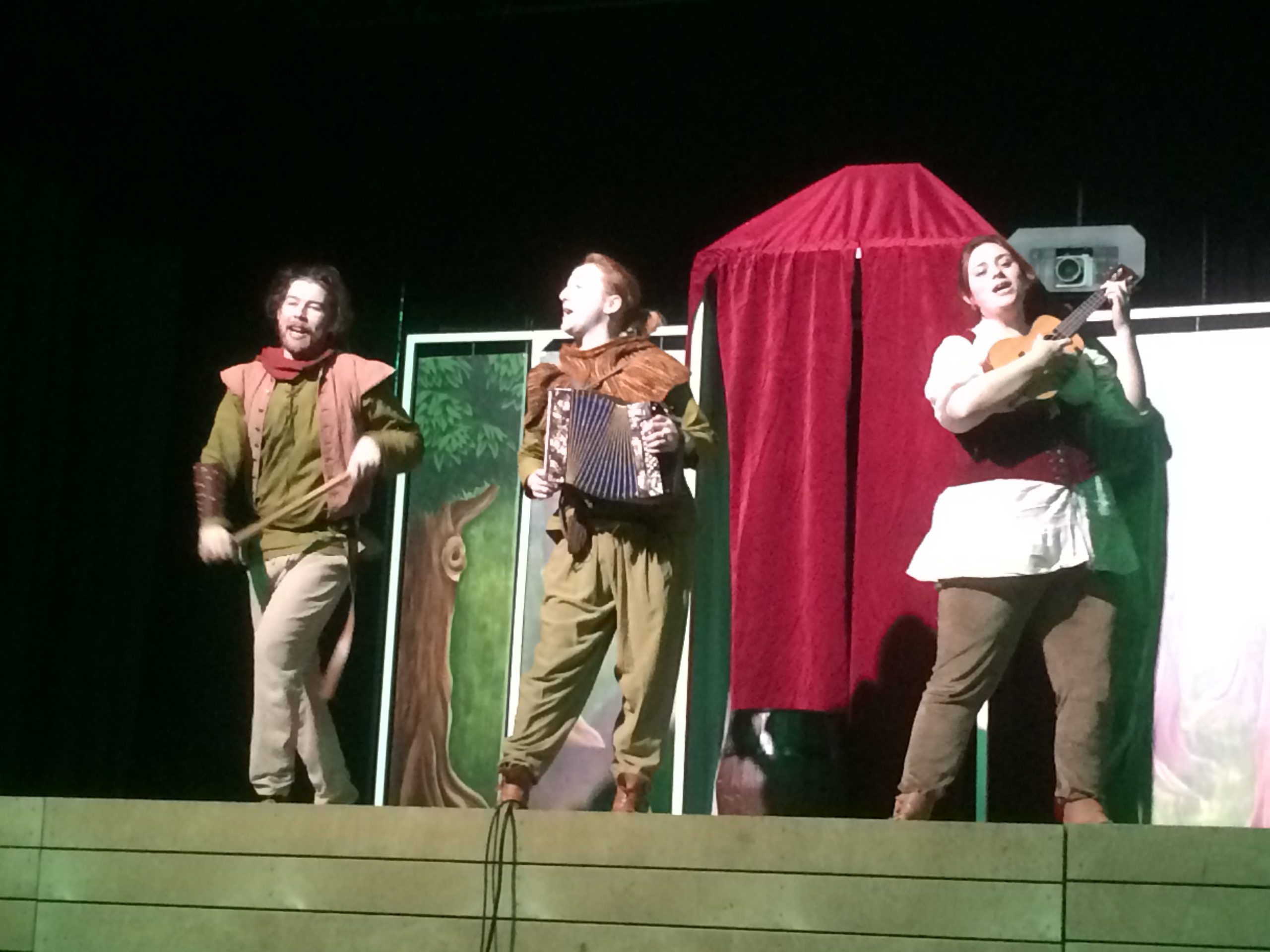 Vor allem der Bösewicht, der auf Kommando von unseren Fünft- und Sechstklässlern lautstark ausgebuht wurde, die vielstimmigen Gesänge der vier vielseitigen Akteure und die witzigen Einlagen und Requisiten (z.B. das Eichhörnchen im Wald oder der Rehbraten) kamen gut an.