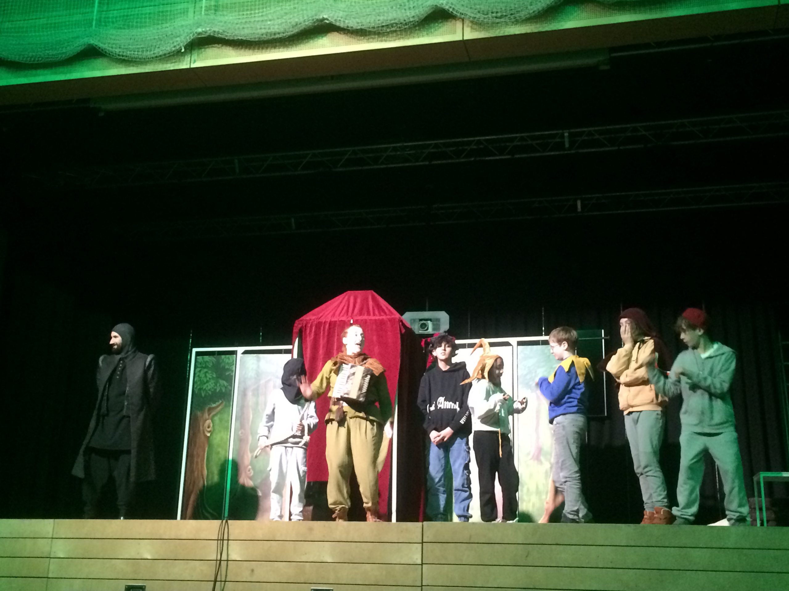 It was the most fun for our fifth- and sixth-graders to shout down the Sheriff’s boasting and to follow the characters into Sherwood Forest with its folk music and its strange creatures (the squirrel). Some pupils even joined the actors on stage and performed really well!