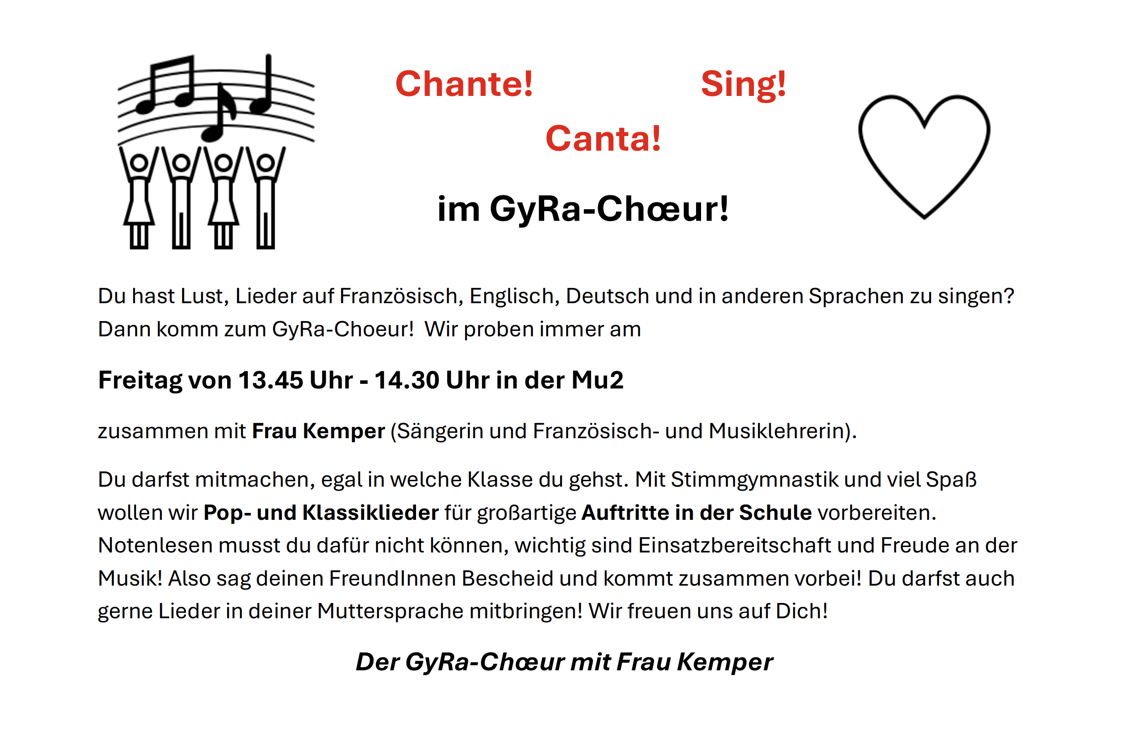 В знову з'явився стабільний хор для всіх від 6-го до 10-го класу! Захоплені співаки з 6-го класу, які вже брали участь у вступних сприємках на початку навчального року разом із флейтами та струнними з курсів інструментів, зараз збираються кожної п’ятниці з 13:45 до 14:30 у маленькому музичному кабінеті та репетирують з пані Кемпер (співачка, викладачка французької та музики) поп- та класичні пісні різними мовами. Поки що ми лише невелика група з 7 учнів і раді будь-яким новим співунам, з якими ми зможемо вразити наших слухачів під час наступних шкільних концертів! Наш наступний виступ — на Концерті Весни у понеділок, 13.4 о 18:00 у форумі, частково разом із флейти та струнними з Інструментальних курсів (пані Кьохлін, пан Бац) та частково разом із хор старшокласників (пані Кемпер), слухайте нас із задоволенням — і якщо вам сподобається, приєднуйтесь до нас незабаром!