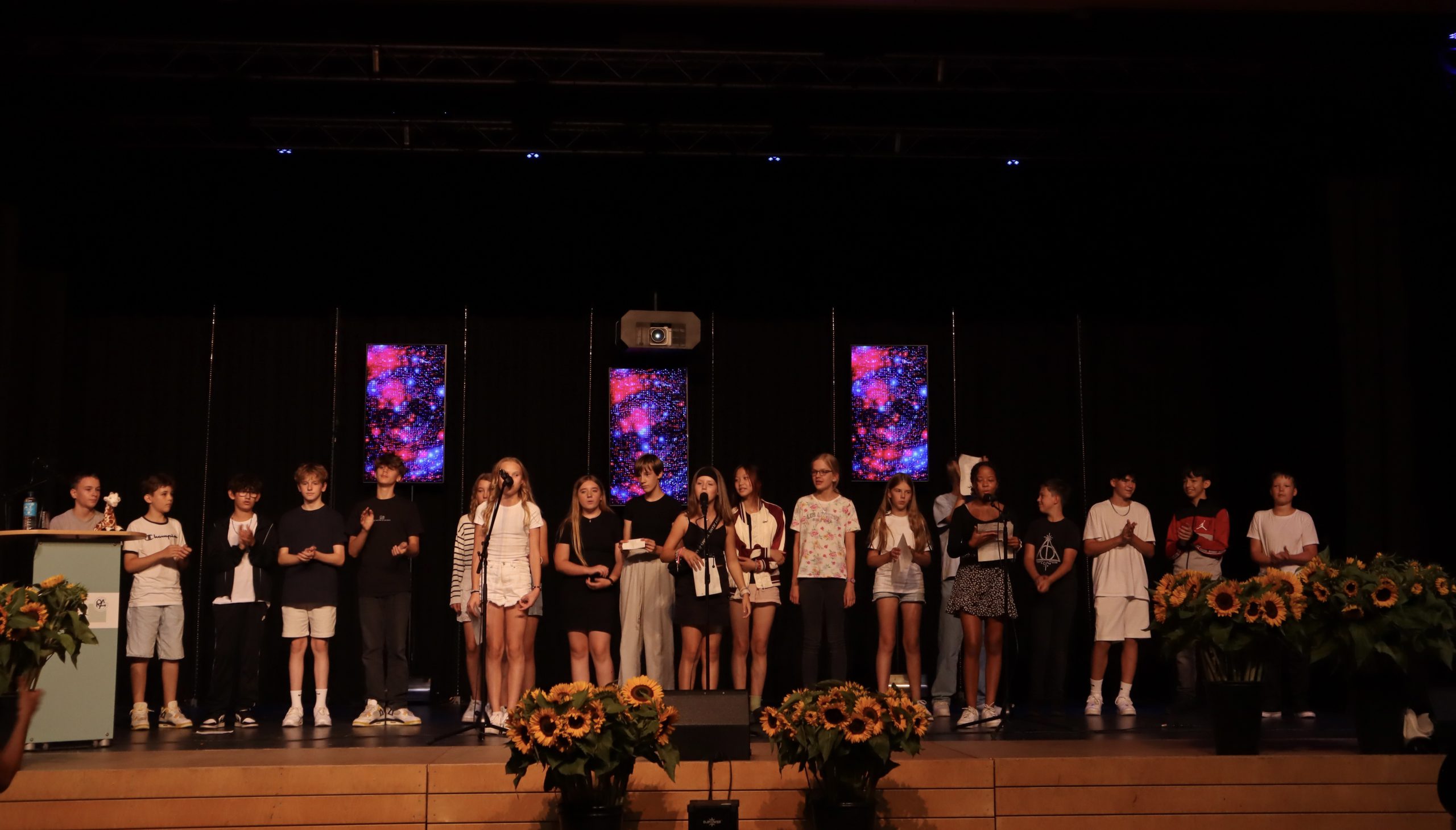 Eine Gruppe von Kindern und Jugendlichen steht auf einer Bühne und bildet mit ihren Händen einen Bogen. Einige Personen tragen weiße T-Shirts, während andere bunte Kleidung tragen. Im Vordergrund stehen Sonnenblumen in Töpfen. Die Szene vermittelt eine festliche Atmosphäre, möglicherweise im Rahmen einer Aufführung oder Feier. Eine Gruppe von Kindern sitzt auf einer Bühne. Im Vordergrund stehen fünf Kinder, die auf einen anderen Jungen oder ein Mädchen schauen, das in einem weißen T-Shirt steht und spricht. Im Hintergrund sitzen weitere Kinder. Vor der Bühne sind große Blumenarrangements mit Sonnenblumen platziert. Der Bühnenhintergrund ist dunkel. Eine Gruppe von Schülerinnen und Schülern steht auf einer Bühne. Sie tragen verschiedene Kleidungsstile, darunter T-Shirts und Shorts. Im Hintergrund sind dekorative Elemente und bunte Lichteffekte zu sehen. Auf der Bühne sind auch große Blumenarrangements platziert. Die Szene vermittelt eine festliche Atmosphäre, möglicherweise während einer Aufführung oder Feier. Gruppe von Kindern in verschiedenen Outfits auf einer Bühne, die sich in Bewegung befinden. Im Vordergrund sind Sonnenblumenarrangements zu sehen, während der Hintergrund dunkel ist.