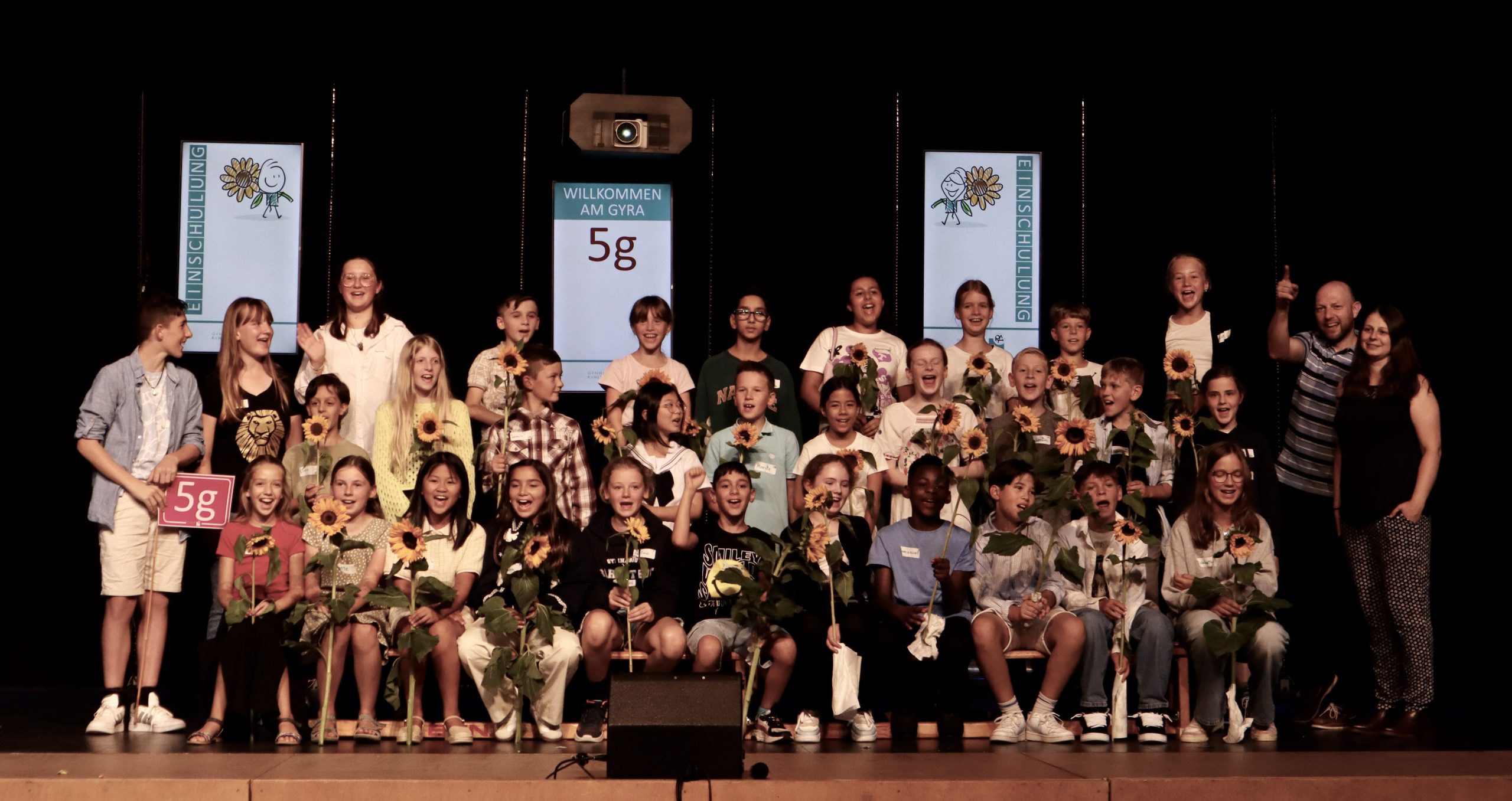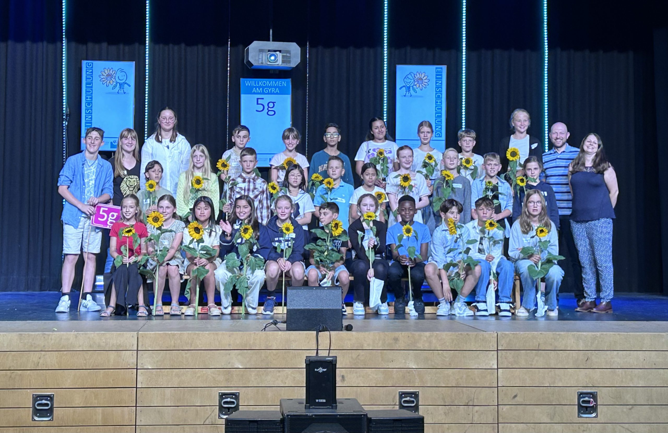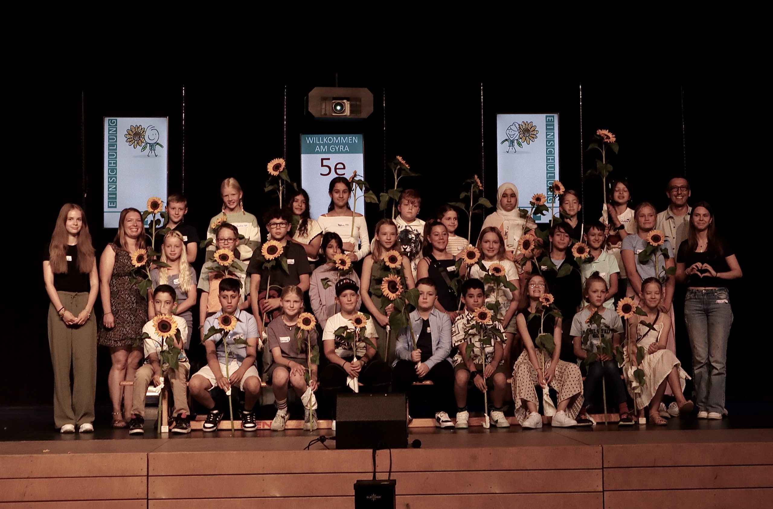 5e: Frau Schmahl, Herr Oluz Gruppe von Kindern und Jugendlichen auf einer Bühne, die zusammen posieren. Einige halten Sonnenblumen in den Händen. Die Gruppe steht in mehreren Reihen, mit unterschiedlichen Kleidungsstilen. Im Hintergrund sind zwei Banner sichtbar. Die Stimmung wirkt fröhlich und festlich.