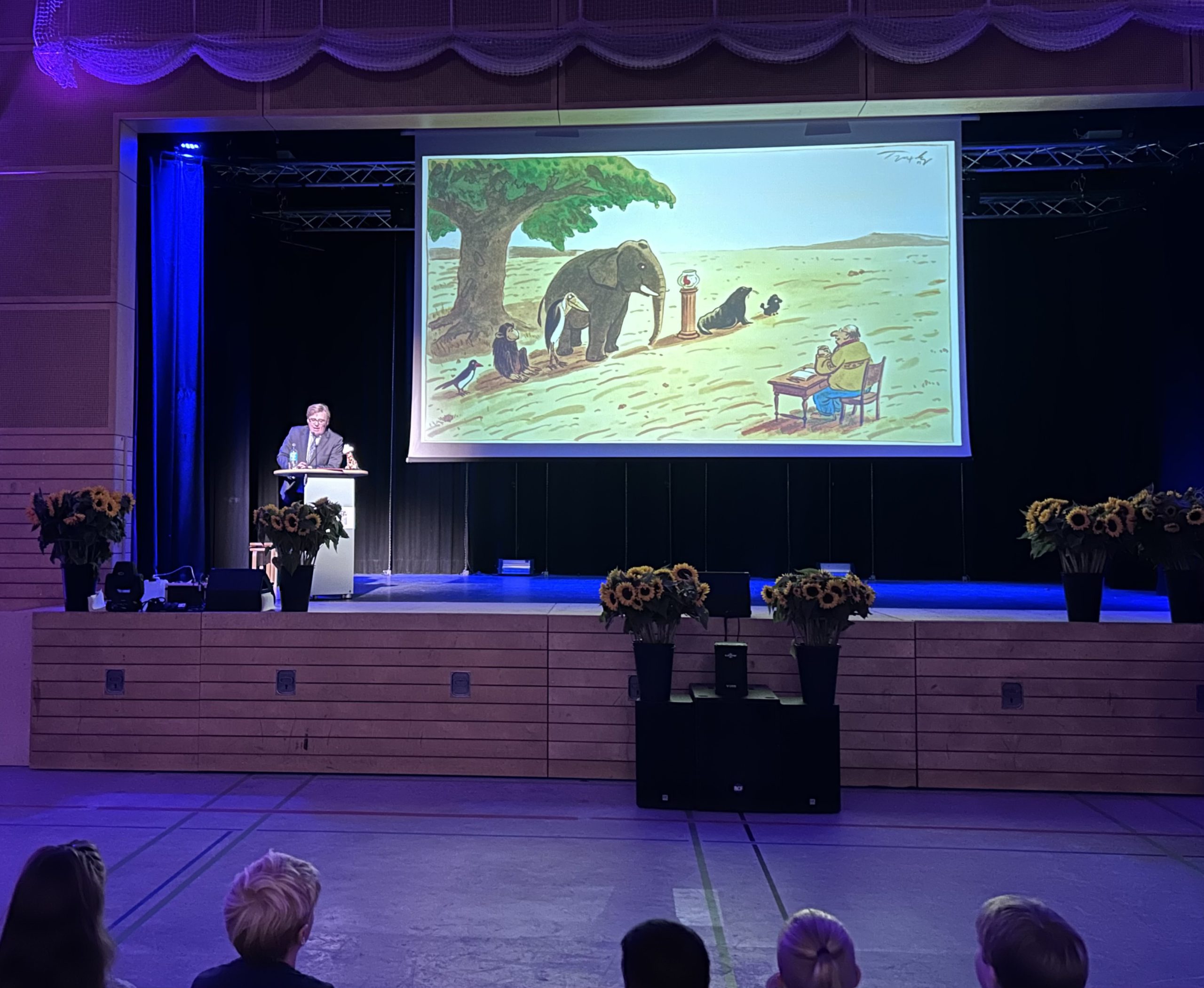 5g: Frau Gebauer, Herr Hencke Eine Frau steht an einem Rednerpult auf einer Bühne, während im Hintergrund ein Bildschirm mit ihrem Namen und Titel zu sehen ist. Der Raum ist schwach beleuchtet und mit Pflanzen dekoriert. Eine Gruppenveranstaltung in einem beleuchteten Raum. Im Vordergrund stehen viele Menschen, die ihre Hände mit farbigen Karten heben. Im Hintergrund ist eine Leinwand mit Präsentationsinhalten sichtbar. Die Beleuchtung ist in lila Tönen gehalten, was eine dynamische Atmosphäre schafft. Eine Gruppe von Menschen sitzt auf Stühlen in einem dunklen Raum. Im Vordergrund steht eine Person an einem Rednerpult, die auf eine große Präsentationsleinwand blickt. Die Leinwand zeigt eine Frage mit mehreren Antwortmöglichkeiten in verschiedenen Farben. Der Raum ist schwach beleuchtet, mit lila Lichtakzenten. Es sind sowohl Erwachsene als auch Kinder im Publikum zu sehen, die aufmerksam nach vorne schauen. Ein Redner steht an einem Pult auf einer Bühne, während im Hintergrund eine Präsentation mit einer Illustration eines Baumes und einer Gruppe von Menschen, die um einen Elefanten versammelt sind, gezeigt wird. Die Bühne ist schwach beleuchtet und mit Pflanzen dekoriert. Im Vordergrund sind einige Zuschauer zu sehen. Ein Mann steht auf einer Bühne und spricht zu einem Publikum. Im Hintergrund ist ein Bildschirm mit dem Text „Klassentheater“ und einem roten Vorhang zu sehen. Der Raum ist in sanftes Licht getaucht, und im Vordergrund sind einige Zuschauer zu erkennen. Blumenarrangements stehen auf der Bühne. Eine Gruppe von Kindern und Jugendlichen steht auf einer Bühne in einem Veranstaltungsraum. Sie tragen verschiedene Kleidung und stehen in einer Reihe, während sie sich dem Publikum präsentieren. Vor der Bühne sind Blumengestecke platziert, und im Vordergrund sind einige Zuschauer zu sehen, die auf die Aufführung schauen. Der Bühnenhintergrund ist dunkel, und es gibt eine Beleuchtung, die die Szenerie hebt. Eine Gruppe von Personen in einheitlichen weißen Outfits steht auf einer Bühne und hält große, bunt beschriftete Plakate hoch, auf denen das Wort Eine Gruppe von Kindern und Jugendlichen steht auf einer Bühne, umgeben von Sonnenblumen. Sie posieren gemeinsam und lächeln, während im Hintergrund schwarze Vorhänge und zwei Bildschirme sichtbar sind. Auf dem Boden stehen Pflanzen mit Sonnenblumen. Eine Gruppe von Schülerinnen und Schülern steht auf einer Bühne, umgeben von großen Sonnenblumen. Sie halten ebenfalls Sonnenblumen in den Händen. Im Hintergrund sind zwei Banner mit der Aufschrift Gruppe von Schülern und Schülerinnen auf einer Bühne, die in zwei Reihen steht. Alle halten Sonnenblumen in den Händen. Im Hintergrund sind Banner mit dem Aufdruck Eine Gruppe von Kindern und Erwachsenen steht lächelnd auf einer Bühne, umgeben von hohen Sonnenblumen. Im Hintergrund sind zwei große Banner und eine Tafel sichtbar. Die Teilnehmer tragen unterschiedliche Kleidung und halten Sonnenblumen in den Händen. Die Bühne hat eine Holzverkleidung und ist in einem dunklen Raum mit Bühnenbeleuchtung. Gruppe von Schülern und Lehrern auf einer Bühne, umgeben von Sonnenblumen. Die Kinder stehen in mehreren Reihen, einige halten Sonnenblumen in den Händen. Im Hintergrund sind Banner sichtbar, die zur Feier des Abschlusses gehören. Die Szene strahlt Freude und Feierlichkeit aus. Eine Gruppe von Schülern steht auf einer Bühne und hält Sonnenblumen in den Händen. Im Hintergrund sind schwarze Vorhänge und zwei blaue Banner zu sehen. Die Schüler sind in verschiedenen Kleidungsstilen gekleidet und lächeln in die Kamera. Die Bühne ist gut beleuchtet. Eine Gruppe von Schülern und Lehrern steht auf einer Bühne. Die Schüler halten Sonnenblumen in den Händen und lächeln. Im Hintergrund sind Banner mit der Aufschrift