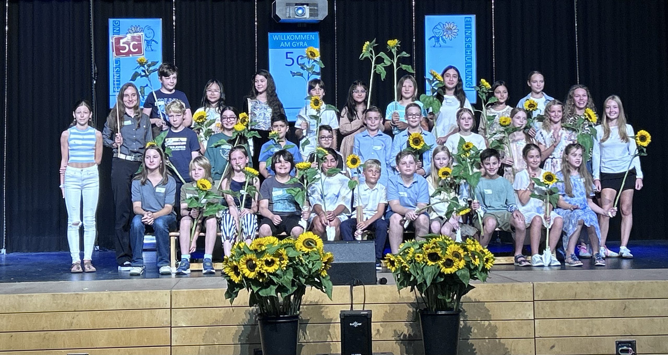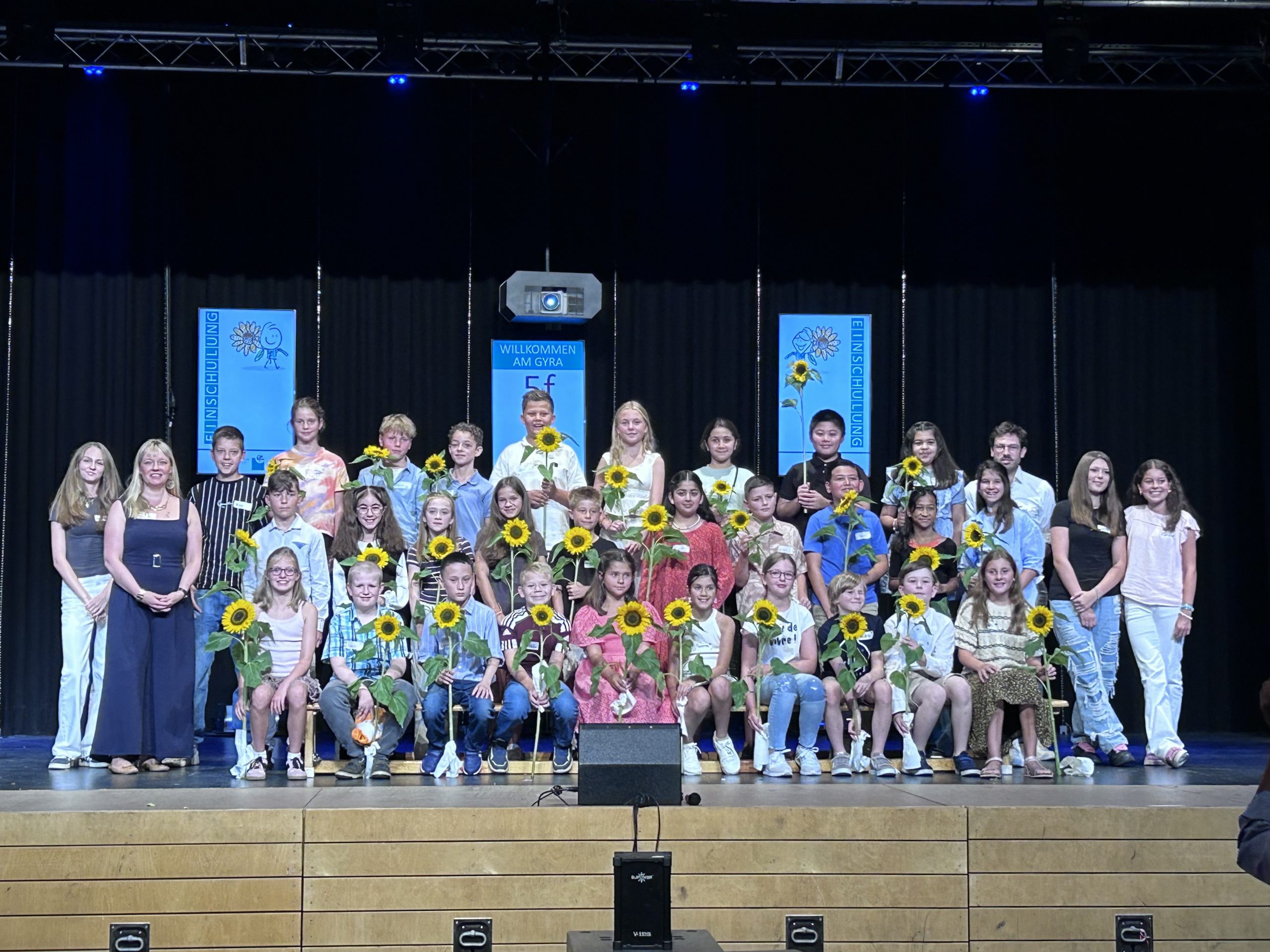 5e: Frau Schmahl, Herr Oluz Gruppe von Kindern und Jugendlichen auf einer Bühne, die zusammen posieren. Einige halten Sonnenblumen in den Händen. Die Gruppe steht in mehreren Reihen, mit unterschiedlichen Kleidungsstilen. Im Hintergrund sind zwei Banner sichtbar. Die Stimmung wirkt fröhlich und festlich.