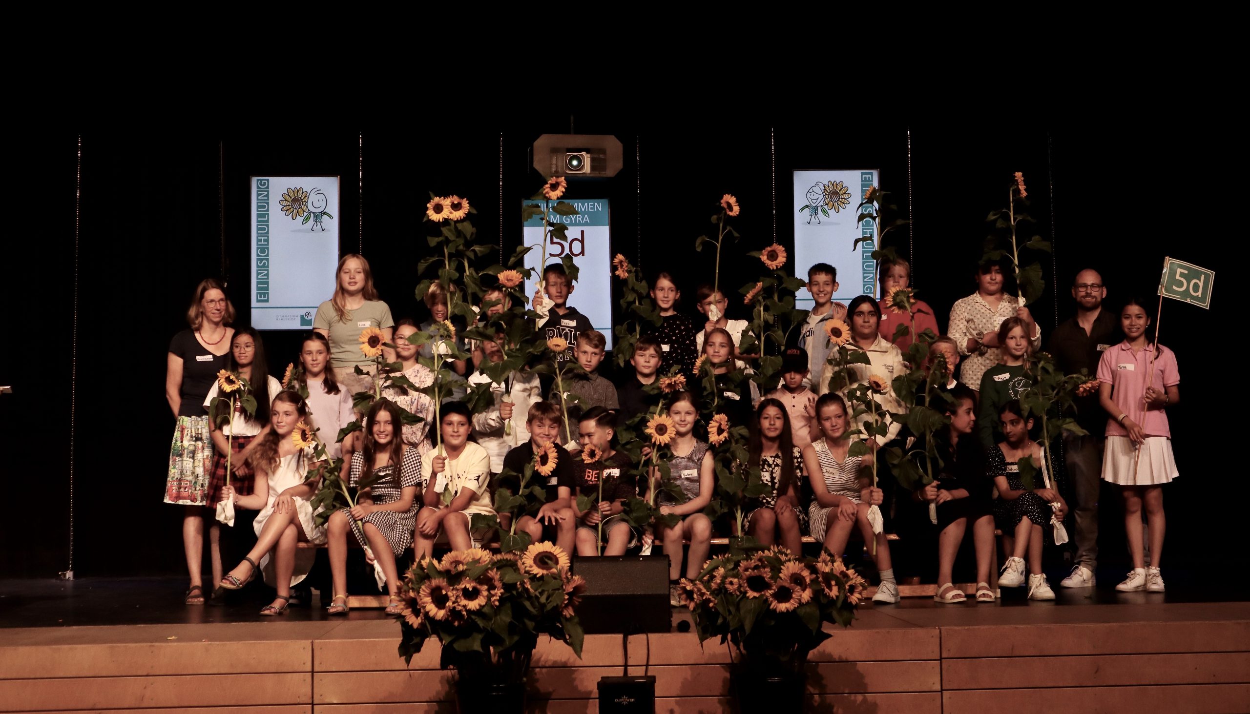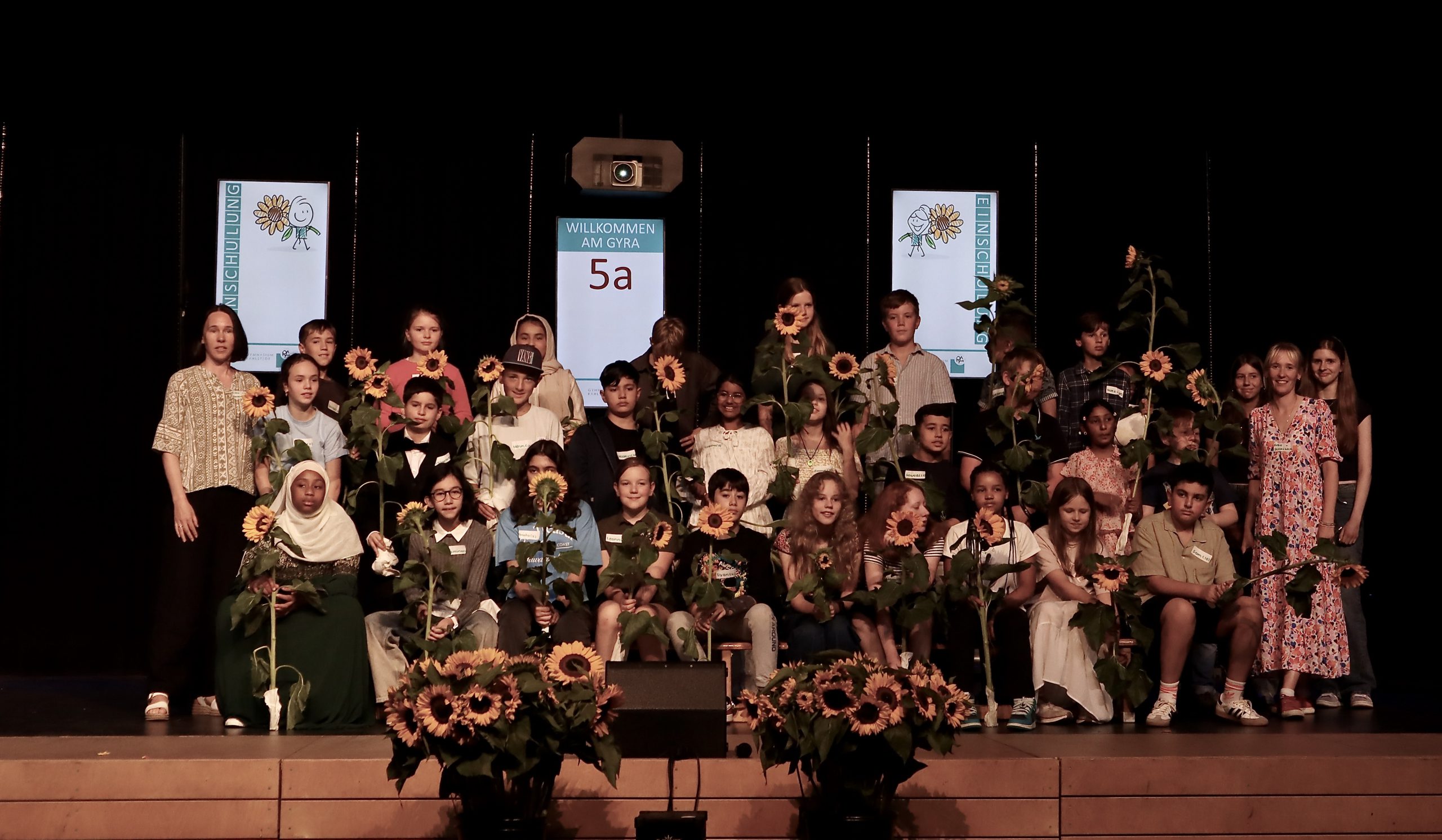 5e: Frau Schmahl, Herr Oluz Gruppe von Kindern und Jugendlichen auf einer Bühne, die zusammen posieren. Einige halten Sonnenblumen in den Händen. Die Gruppe steht in mehreren Reihen, mit unterschiedlichen Kleidungsstilen. Im Hintergrund sind zwei Banner sichtbar. Die Stimmung wirkt fröhlich und festlich.