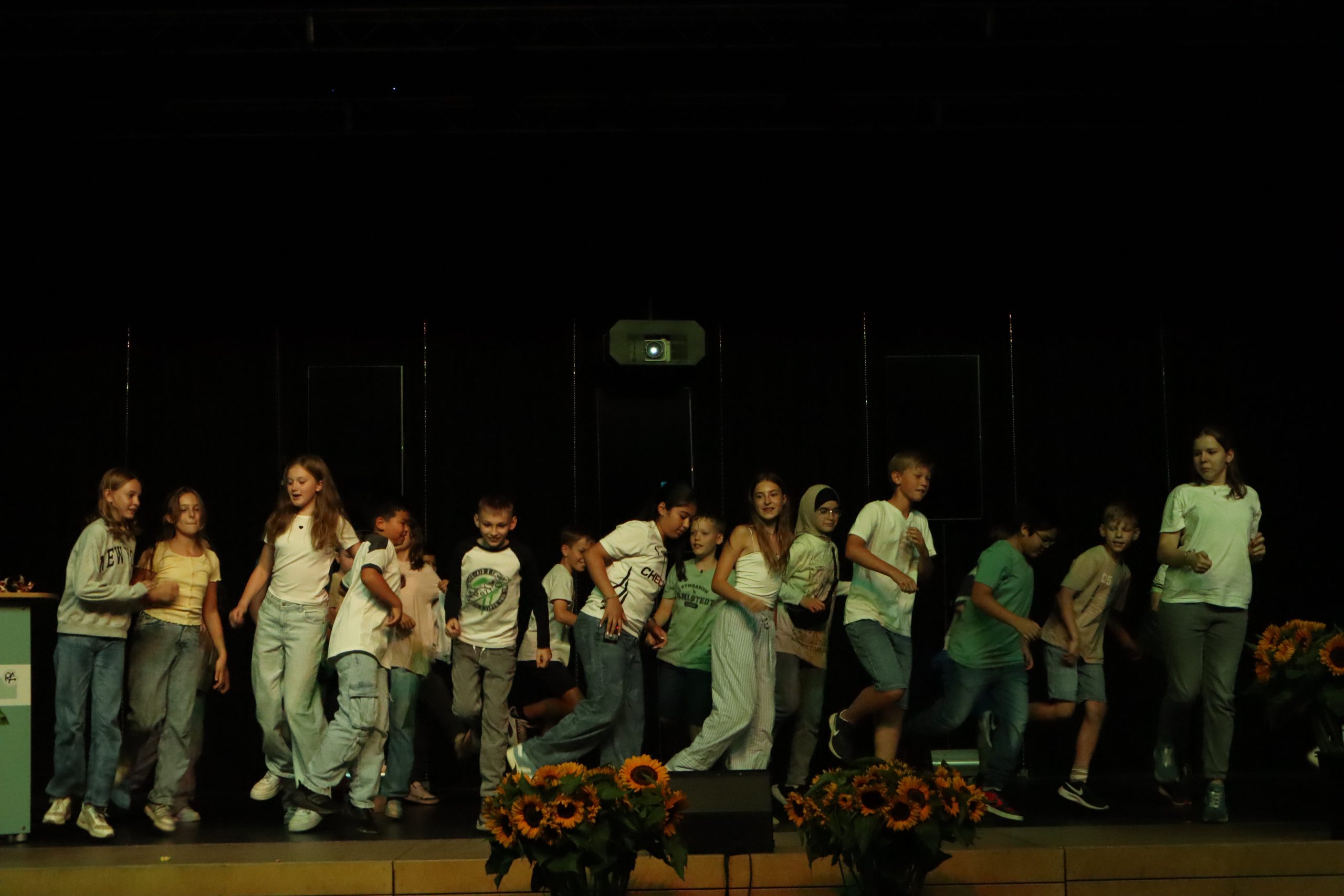 Eine Gruppe von Kindern und Jugendlichen steht auf einer Bühne und bildet mit ihren Händen einen Bogen. Einige Personen tragen weiße T-Shirts, während andere bunte Kleidung tragen. Im Vordergrund stehen Sonnenblumen in Töpfen. Die Szene vermittelt eine festliche Atmosphäre, möglicherweise im Rahmen einer Aufführung oder Feier. Eine Gruppe von Kindern sitzt auf einer Bühne. Im Vordergrund stehen fünf Kinder, die auf einen anderen Jungen oder ein Mädchen schauen, das in einem weißen T-Shirt steht und spricht. Im Hintergrund sitzen weitere Kinder. Vor der Bühne sind große Blumenarrangements mit Sonnenblumen platziert. Der Bühnenhintergrund ist dunkel. Eine Gruppe von Schülerinnen und Schülern steht auf einer Bühne. Sie tragen verschiedene Kleidungsstile, darunter T-Shirts und Shorts. Im Hintergrund sind dekorative Elemente und bunte Lichteffekte zu sehen. Auf der Bühne sind auch große Blumenarrangements platziert. Die Szene vermittelt eine festliche Atmosphäre, möglicherweise während einer Aufführung oder Feier. Gruppe von Kindern in verschiedenen Outfits auf einer Bühne, die sich in Bewegung befinden. Im Vordergrund sind Sonnenblumenarrangements zu sehen, während der Hintergrund dunkel ist.