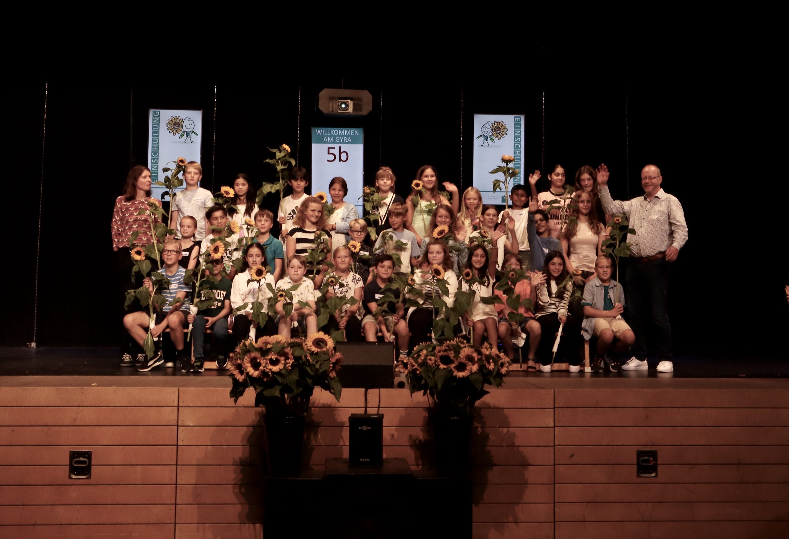 5e: Frau Schmahl, Herr Oluz Gruppe von Kindern und Jugendlichen auf einer Bühne, die zusammen posieren. Einige halten Sonnenblumen in den Händen. Die Gruppe steht in mehreren Reihen, mit unterschiedlichen Kleidungsstilen. Im Hintergrund sind zwei Banner sichtbar. Die Stimmung wirkt fröhlich und festlich.
