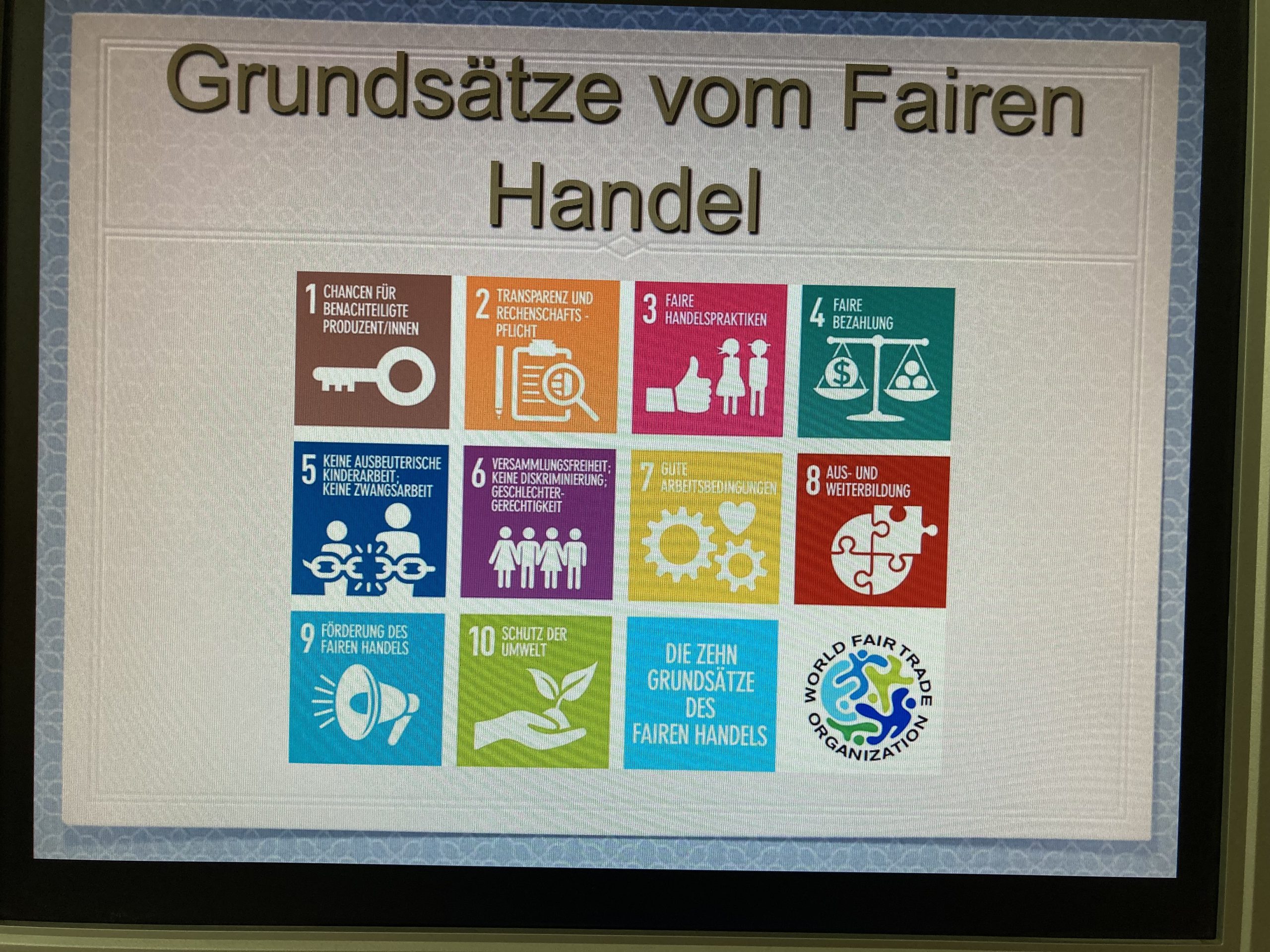 Der Besuch fand im Rahmen des Förderprogramms „Entwicklungspolitische Bildung“ statt und die FÖJler Marlena und Luca haben großartig durch die beiden Stunden geführt. Über den Vortrag „Fairtrade – wesentlich für nachhaltige Entwicklung?!“ konnte diskutiert werden und es gab ein spannendes Quiz.