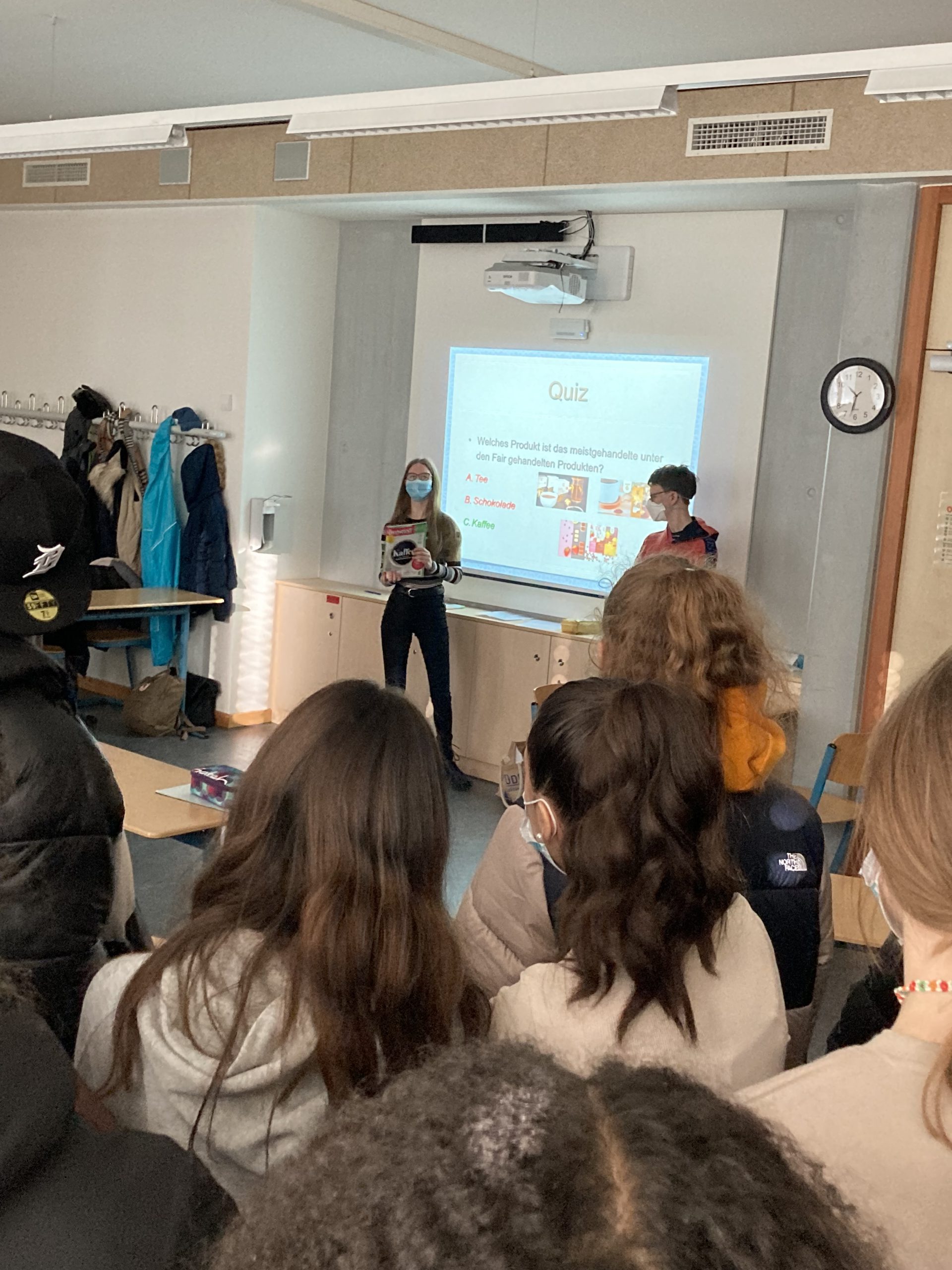 Der Besuch fand im Rahmen des Förderprogramms „Entwicklungspolitische Bildung“ statt und die FÖJler Marlena und Luca haben großartig durch die beiden Stunden geführt. Über den Vortrag „Fairtrade – wesentlich für nachhaltige Entwicklung?!“ konnte diskutiert werden und es gab ein spannendes Quiz.