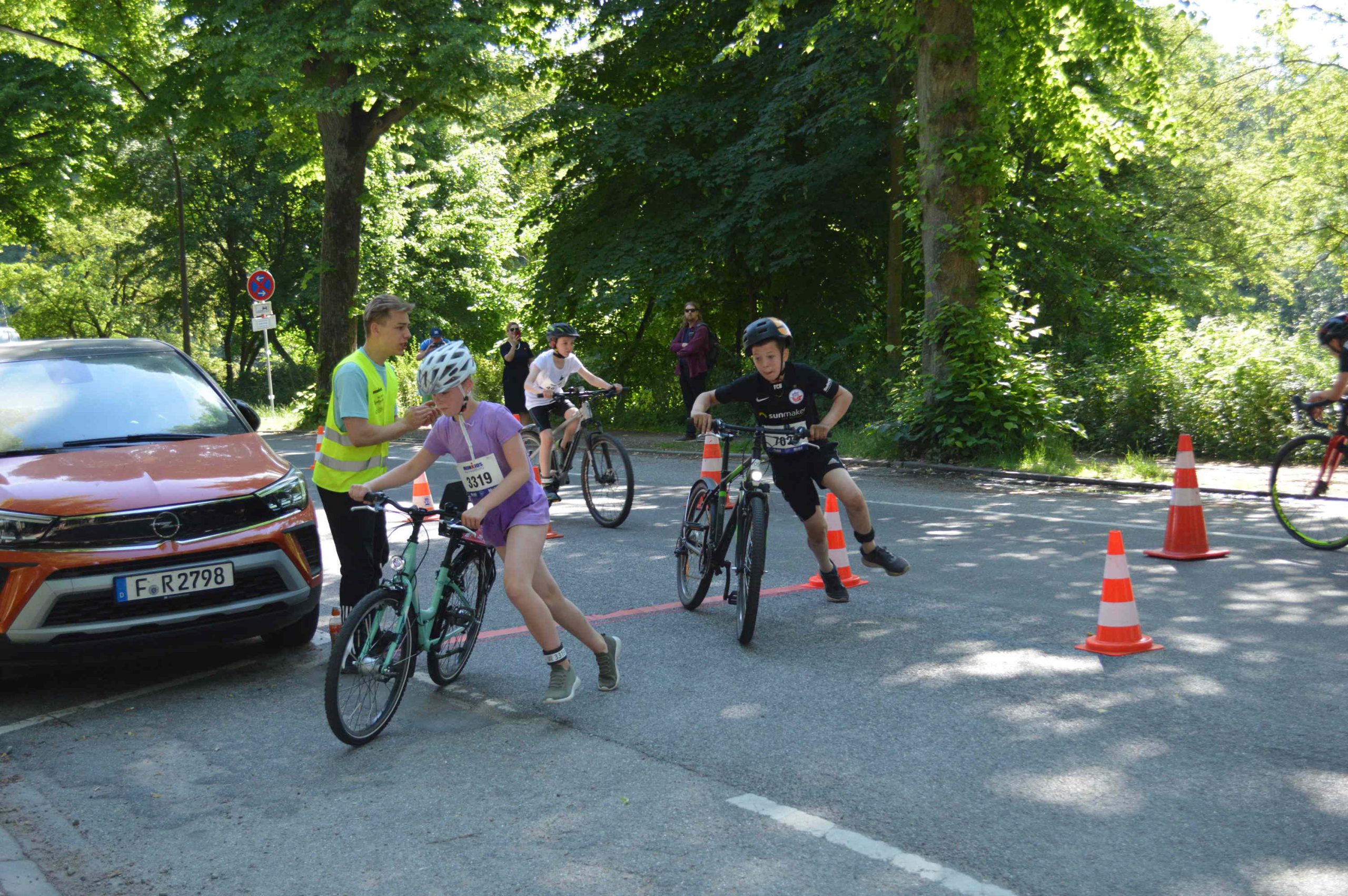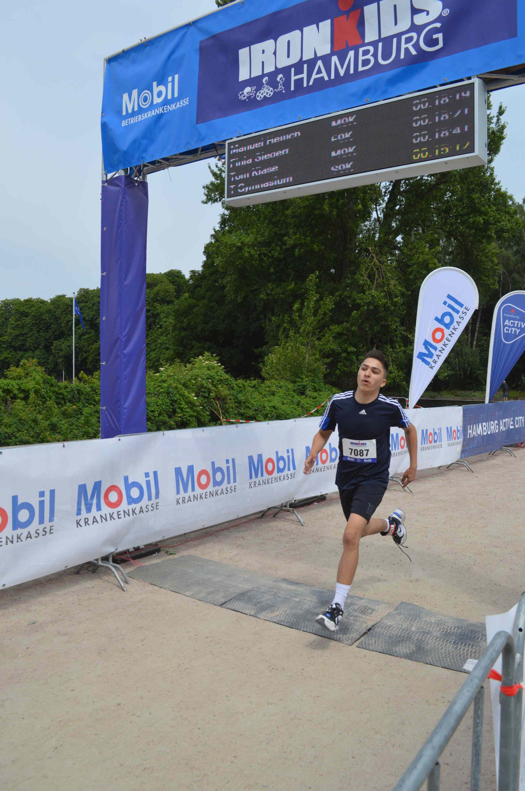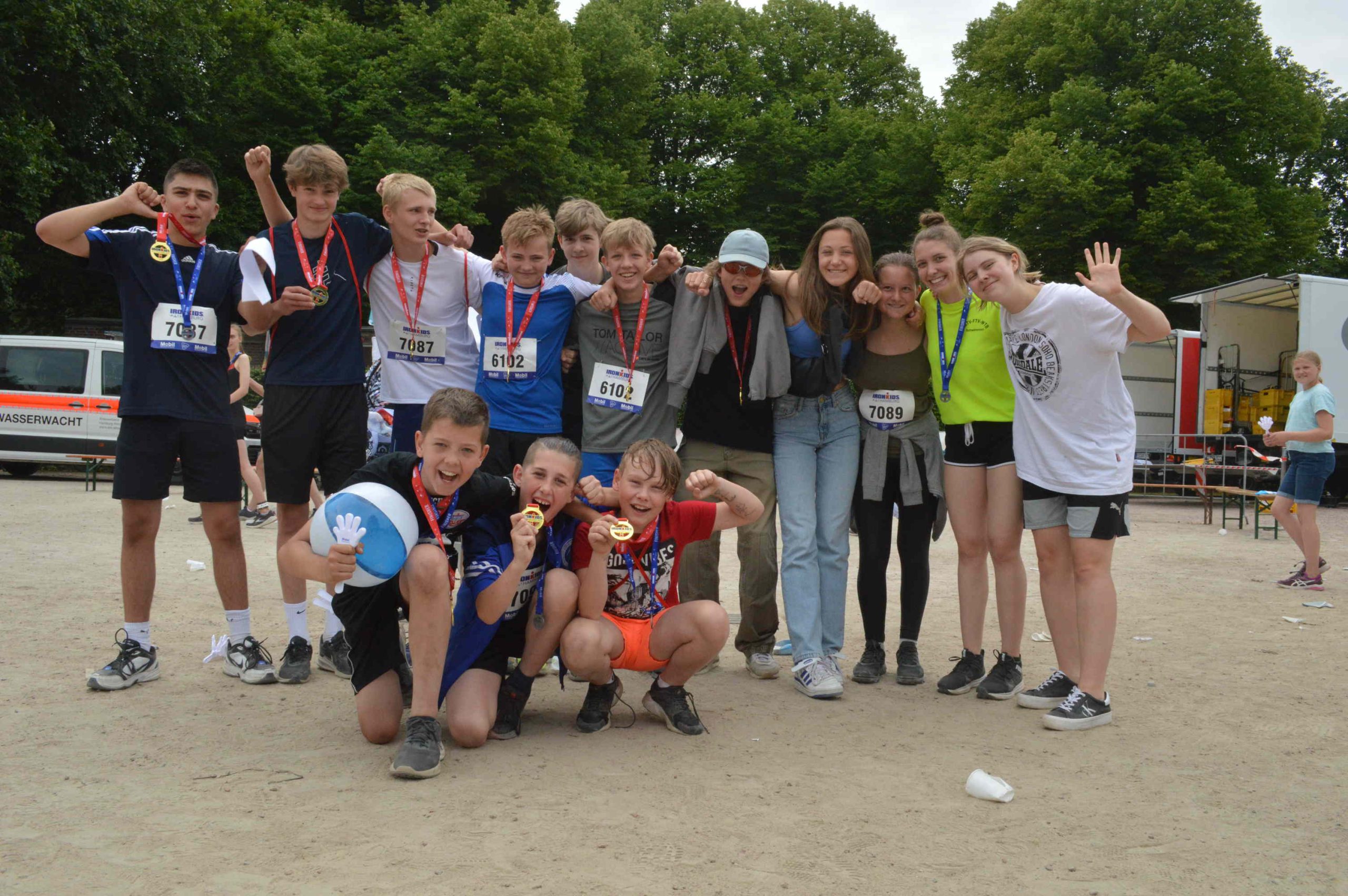 Drei junge Teilnehmer stehen auf einem Siegerpodest beim Ironkids Hamburg 2022. Sie tragen Medaillen um den Hals und schauen lächelnd in die Kamera. Im Hintergrund sind Banner mit Logos und Sponsoreninformationen zu sehen. Drei junge Athleten stehen auf einem Podium und tragen Medaillen. Der Hintergrund zeigt eine Sponsorenwand mit Logos. Es ist ein sonniger Tag, und im Hintergrund sind Bäume und Wasser sichtbar. Einige Zuschauer sind im Bild zu erkennen. Zwei Jungen bücken sich über ein Fahrrad auf einem staubigen Boden. Im Hintergrund sind weitere Personen zu sehen, die auf Fahrrädern sitzen oder sich aufhalten. Umgeben von Bäumen und grünen Sträuchern. Eine goldene Medaille mit rotem Band wird von einer Hand gehalten. Auf der Medaille steht Gruppe von Jugendlichen, die fröhlich posieren und Medaillen tragen. Einige halten Bälle in den Händen, andere zeigen ihre Freude mit gestreckten Armen. Der Hintergrund zeigt eine Outdoor-Umgebung mit Bäumen und einer Veranstaltungseinrichtung. Ein Läufer überquert die Ziellinie eines Ironman-Wettbewerbs in Hamburg. Im Hintergrund sind ein Zeitmessungsdisplay und Werbebanner sichtbar. Die Atmosphäre ist sportlich und dynamisch. Läufer überquert die Ziellinie eines Wettkampfs mit einem Banner Ein Mann läuft auf einem gepflasterten Weg entlang eines Gewässers. Im Hintergrund sind Bäume und eine Veranstaltungstafel mit dem Schriftzug Kinder fahren mit Fahrrädern an einem Verkehrstraining oder Wettkampf. Ein Erwachsener in einer Warnweste gibt Anweisungen. Im Hintergrund sind Verkehrsleitkegel und ein Auto zu sehen. Die Umgebung ist von Bäumen umgeben und es ist sonnig. Drei Kinder stehen lächelnd vor einer Fahrradbarriere im Freien. Eines der Kinder sitzt auf der Barriere, während die anderen beiden daneben stehen. Sie tragen Sportbekleidung und haben Fahrräder im Hintergrund. Die Szene wirkt fröhlich und aktiv.