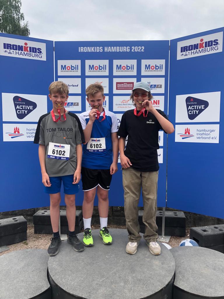 Drei junge Teilnehmer stehen auf einem Siegerpodest beim Ironkids Hamburg 2022. Sie tragen Medaillen um den Hals und schauen lächelnd in die Kamera. Im Hintergrund sind Banner mit Logos und Sponsoreninformationen zu sehen. Drei junge Athleten stehen auf einem Podium und tragen Medaillen. Der Hintergrund zeigt eine Sponsorenwand mit Logos. Es ist ein sonniger Tag, und im Hintergrund sind Bäume und Wasser sichtbar. Einige Zuschauer sind im Bild zu erkennen. Zwei Jungen bücken sich über ein Fahrrad auf einem staubigen Boden. Im Hintergrund sind weitere Personen zu sehen, die auf Fahrrädern sitzen oder sich aufhalten. Umgeben von Bäumen und grünen Sträuchern. Eine goldene Medaille mit rotem Band wird von einer Hand gehalten. Auf der Medaille steht Gruppe von Jugendlichen, die fröhlich posieren und Medaillen tragen. Einige halten Bälle in den Händen, andere zeigen ihre Freude mit gestreckten Armen. Der Hintergrund zeigt eine Outdoor-Umgebung mit Bäumen und einer Veranstaltungseinrichtung. Ein Läufer überquert die Ziellinie eines Ironman-Wettbewerbs in Hamburg. Im Hintergrund sind ein Zeitmessungsdisplay und Werbebanner sichtbar. Die Atmosphäre ist sportlich und dynamisch. Läufer überquert die Ziellinie eines Wettkampfs mit einem Banner Ein Mann läuft auf einem gepflasterten Weg entlang eines Gewässers. Im Hintergrund sind Bäume und eine Veranstaltungstafel mit dem Schriftzug Kinder fahren mit Fahrrädern an einem Verkehrstraining oder Wettkampf. Ein Erwachsener in einer Warnweste gibt Anweisungen. Im Hintergrund sind Verkehrsleitkegel und ein Auto zu sehen. Die Umgebung ist von Bäumen umgeben und es ist sonnig. Drei Kinder stehen lächelnd vor einer Fahrradbarriere im Freien. Eines der Kinder sitzt auf der Barriere, während die anderen beiden daneben stehen. Sie tragen Sportbekleidung und haben Fahrräder im Hintergrund. Die Szene wirkt fröhlich und aktiv.