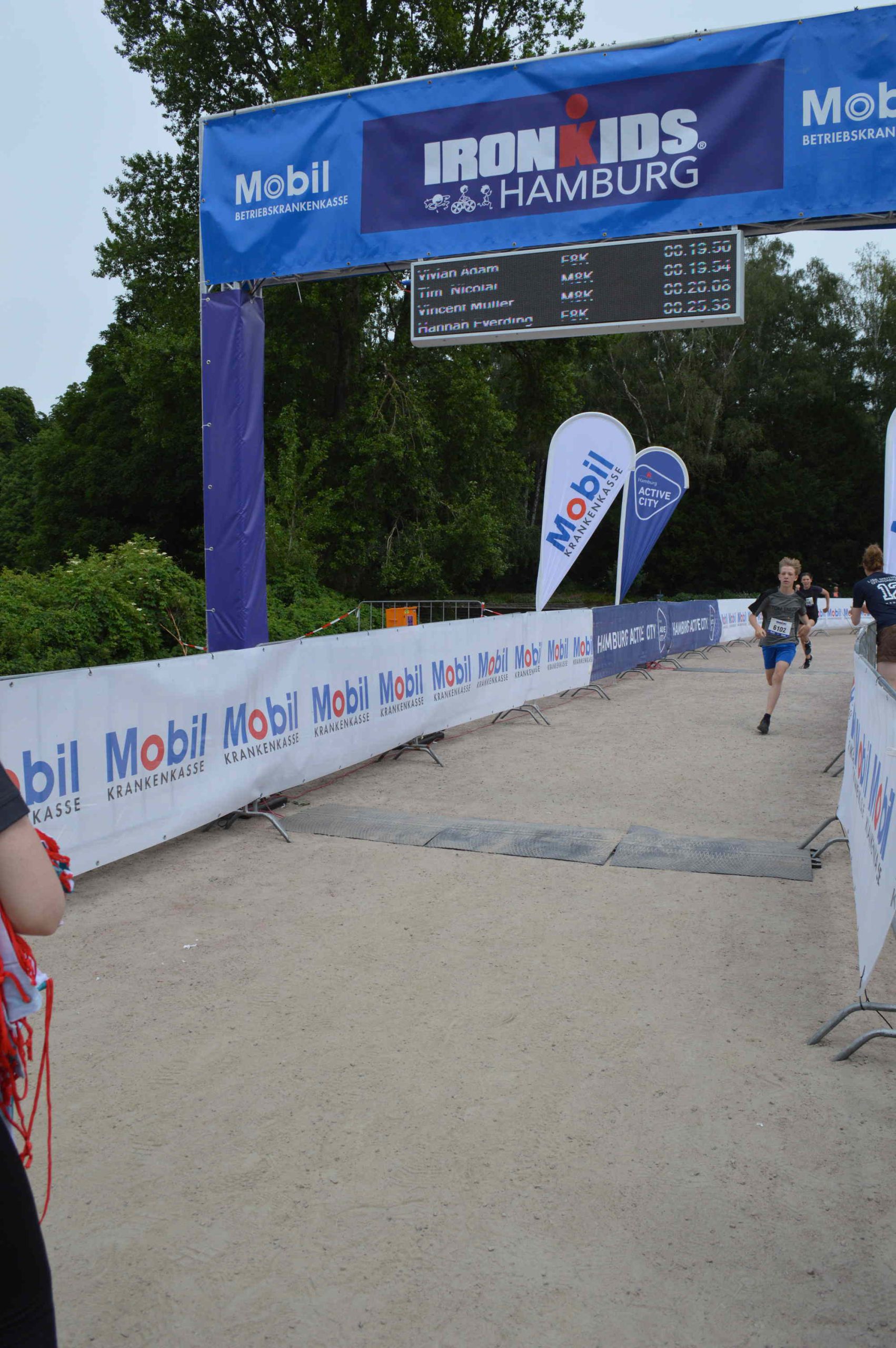 Drei junge Teilnehmer stehen auf einem Siegerpodest beim Ironkids Hamburg 2022. Sie tragen Medaillen um den Hals und schauen lächelnd in die Kamera. Im Hintergrund sind Banner mit Logos und Sponsoreninformationen zu sehen. Drei junge Athleten stehen auf einem Podium und tragen Medaillen. Der Hintergrund zeigt eine Sponsorenwand mit Logos. Es ist ein sonniger Tag, und im Hintergrund sind Bäume und Wasser sichtbar. Einige Zuschauer sind im Bild zu erkennen. Zwei Jungen bücken sich über ein Fahrrad auf einem staubigen Boden. Im Hintergrund sind weitere Personen zu sehen, die auf Fahrrädern sitzen oder sich aufhalten. Umgeben von Bäumen und grünen Sträuchern. Eine goldene Medaille mit rotem Band wird von einer Hand gehalten. Auf der Medaille steht Gruppe von Jugendlichen, die fröhlich posieren und Medaillen tragen. Einige halten Bälle in den Händen, andere zeigen ihre Freude mit gestreckten Armen. Der Hintergrund zeigt eine Outdoor-Umgebung mit Bäumen und einer Veranstaltungseinrichtung. Ein Läufer überquert die Ziellinie eines Ironman-Wettbewerbs in Hamburg. Im Hintergrund sind ein Zeitmessungsdisplay und Werbebanner sichtbar. Die Atmosphäre ist sportlich und dynamisch. Läufer überquert die Ziellinie eines Wettkampfs mit einem Banner Ein Mann läuft auf einem gepflasterten Weg entlang eines Gewässers. Im Hintergrund sind Bäume und eine Veranstaltungstafel mit dem Schriftzug Kinder fahren mit Fahrrädern an einem Verkehrstraining oder Wettkampf. Ein Erwachsener in einer Warnweste gibt Anweisungen. Im Hintergrund sind Verkehrsleitkegel und ein Auto zu sehen. Die Umgebung ist von Bäumen umgeben und es ist sonnig. Drei Kinder stehen lächelnd vor einer Fahrradbarriere im Freien. Eines der Kinder sitzt auf der Barriere, während die anderen beiden daneben stehen. Sie tragen Sportbekleidung und haben Fahrräder im Hintergrund. Die Szene wirkt fröhlich und aktiv.