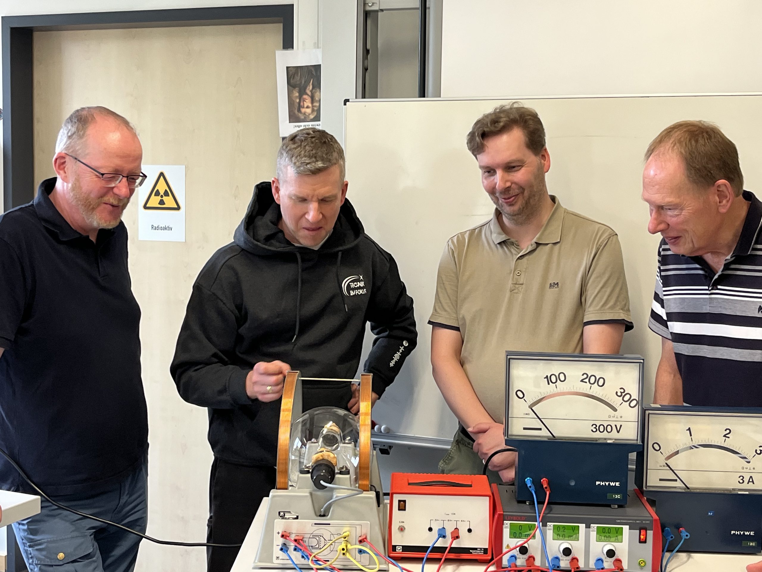 Mit dem neuen Röhrennetzgerät können Experimente mit dem Fadenstrahlrohr nun wieder durchgeführt werden. Beim Fadenstrahlrohr werden Elektronen von einem elektrischen Feld beschleunigt und in einem Magnetfeld auf eine Kreisbahn gelenkt. Dabei lässt sich mithilfe des Aufbaus auch die spezifische Ladung eines Elektrons bestimmen.