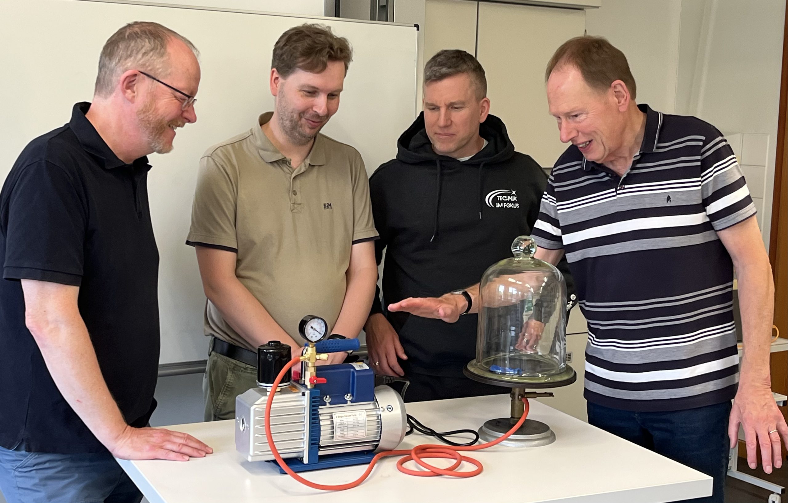 Vier Männer stehen um einen Tisch, auf dem eine Vakuumpumpe und eine Glasglocke platziert sind. Sie beobachten gemeinsam das Equipment und diskutieren darüber. Im Hintergrund ist eine weiße Wand zu sehen.
