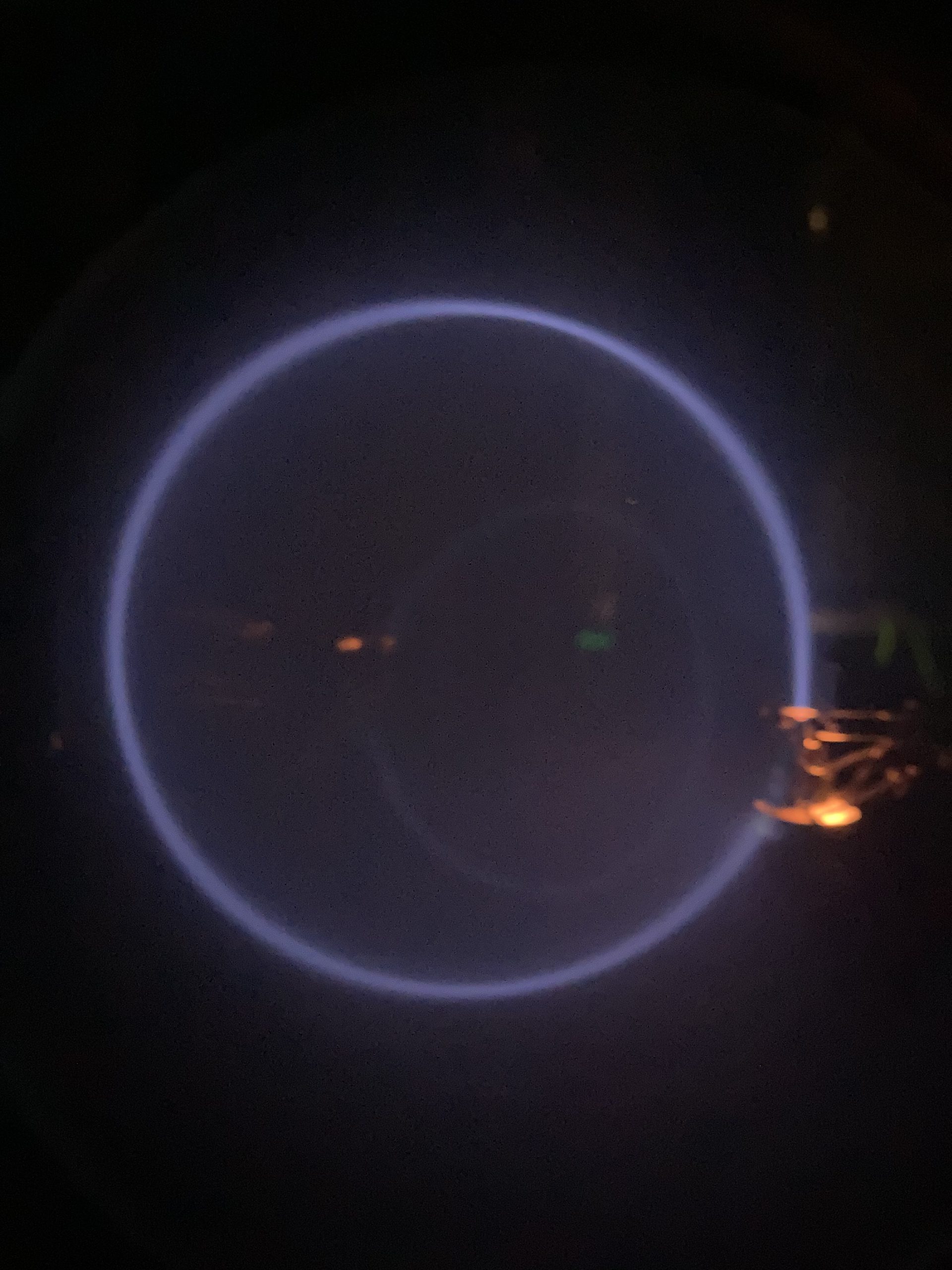 Ein schwach leuchtender, bläulicher Kreis vor einem dunklen Hintergrund, mit unscharfen Lichtern im Vordergrund.