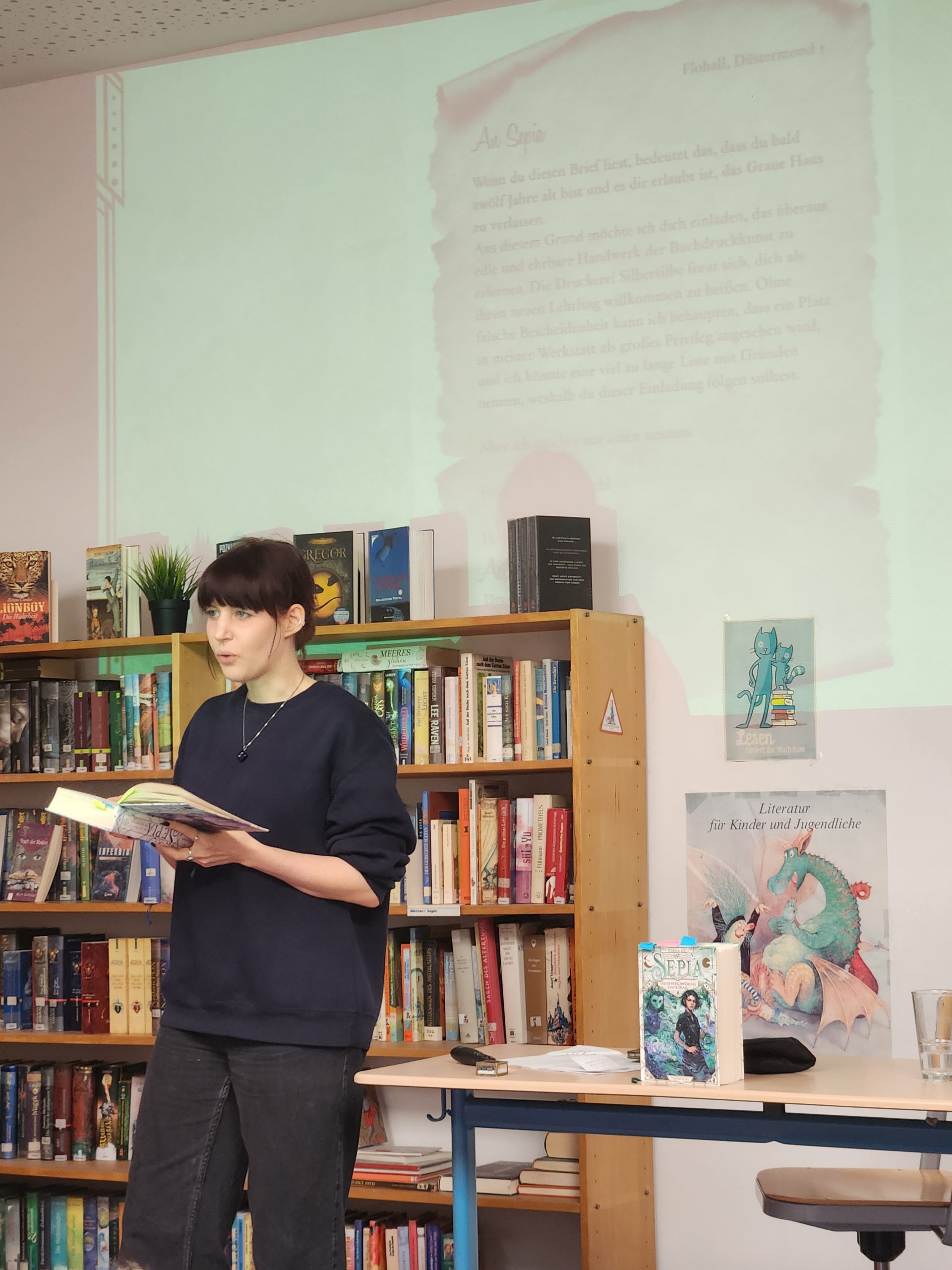 Am Montag, den 13. Oktober 2025, besuchten vier fünfte Klassen eine Lesung der Autorin Theresa Bell in der Bibliothek unserer Schule. In gemütlicher Atmosphäre las die Autorin aus ihren beiden Romanen „Sepia und das Erwachen der Tintenmagie“ und „Sepia und die Verschwörung von Flohall“. Dabei fesselte sie uns mit der Geschichte rund um das zwölfjährige Waisenkind Sepia, das nach einem mysteriösen Brief von Silbersilbe, einem der drei großen Meister, nach Flohall reist. Flohall ist eine berühmte Hafenstadt, in der Tinte und Bücher wertvoller sind als Gold. Bei Meister Silbersilbe soll Sepia das Handwerk des Buchdrucks erlernen. Doch warum gerade sie – ein tollpatschiges Mädchen, das ständig Tintenflecke an den Fingern hat – auserwählt wurde, bleibt Sepia ein Rätsel. Als ihr immer wieder mysteriöse Dinge passieren, versucht sie, diesen mithilfe ihrer zwei neuen Freunde Niki und Sanzio auf den Grund zu gehen.