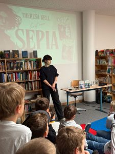 Am Montag, den 13. Oktober 2025, besuchten vier fünfte Klassen eine Lesung der Autorin Theresa Bell in der Bibliothek unserer Schule. In gemütlicher Atmosphäre las die Autorin aus ihren beiden Romanen „Sepia und das Erwachen der Tintenmagie“ und „Sepia und die Verschwörung von Flohall“. Dabei fesselte sie uns mit der Geschichte rund um das zwölfjährige Waisenkind Sepia, das nach einem mysteriösen Brief von Silbersilbe, einem der drei großen Meister, nach Flohall reist. Flohall ist eine berühmte Hafenstadt, in der Tinte und Bücher wertvoller sind als Gold. Bei Meister Silbersilbe soll Sepia das Handwerk des Buchdrucks erlernen. Doch warum gerade sie – ein tollpatschiges Mädchen, das ständig Tintenflecke an den Fingern hat – auserwählt wurde, bleibt Sepia ein Rätsel. Als ihr immer wieder mysteriöse Dinge passieren, versucht sie, diesen mithilfe ihrer zwei neuen Freunde Niki und Sanzio auf den Grund zu gehen.