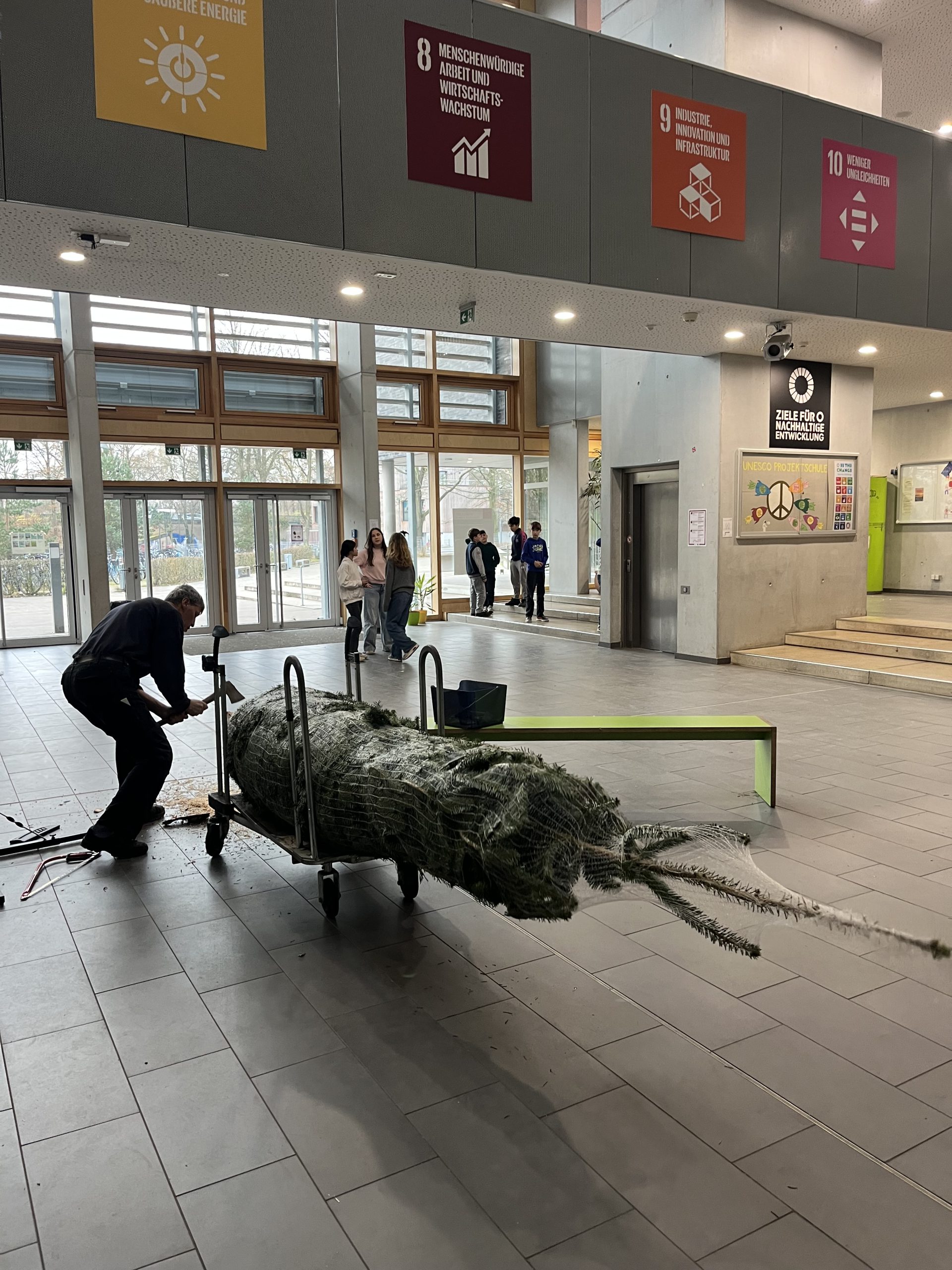Seit dieser Woche strahlt im Atrium des GyRas unser großer Weihnachtsbaum. Mit seinen stolzen sechs bis sieben Metern Höhe sowie mit seinem warmen Lichterglanz ist er unübersehbar.