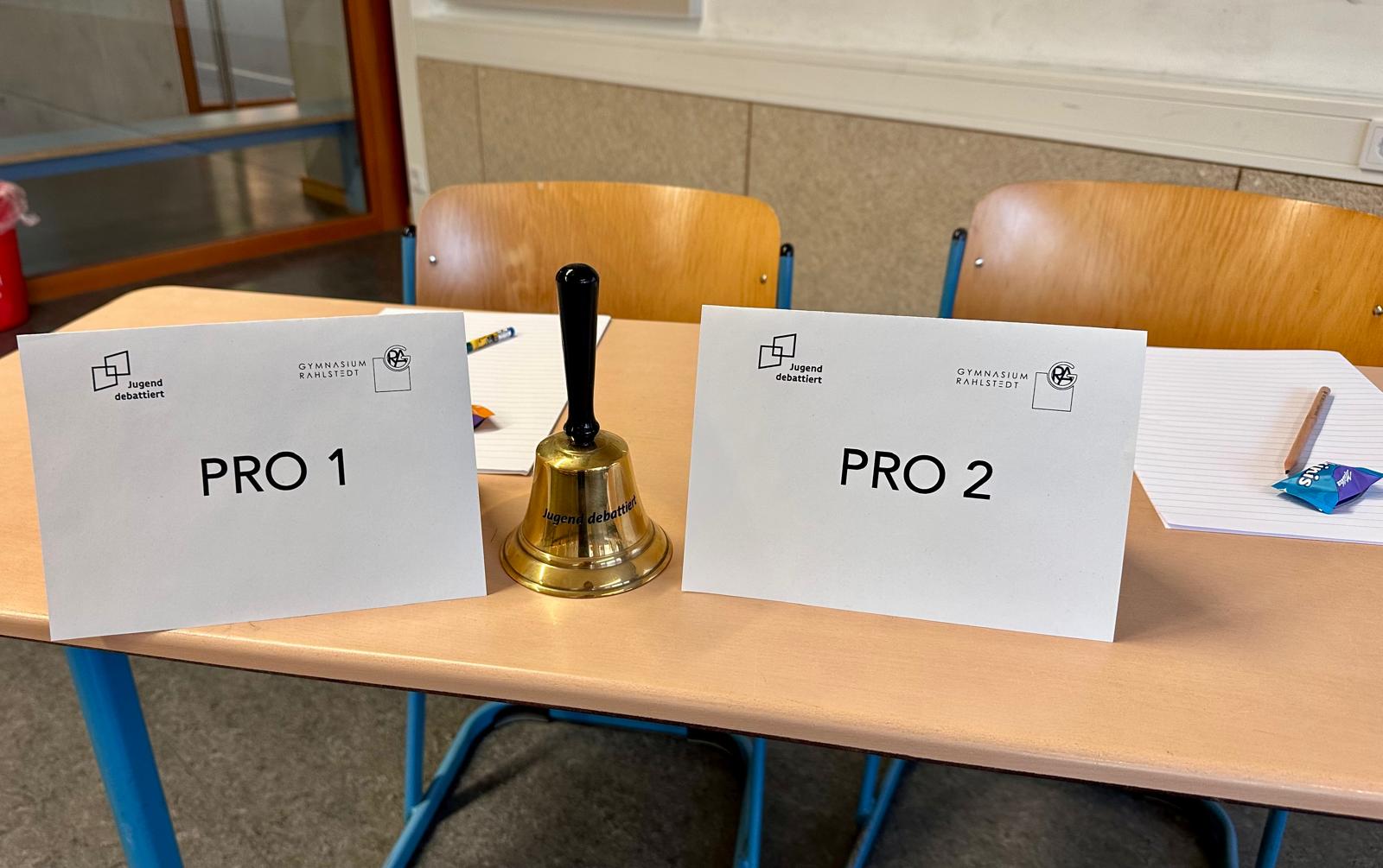 Ab 12 Uhr lieferten sie sich im Atrium wortgewandt einen aspektreichen Schlagabtausch zur Frage, ob alle Schüler*innen und Lehrkräfte des GyRa zur Teilnahme an zwei außerschulischen Veranstaltungen pro Jahr verpflichtet werden sollten.